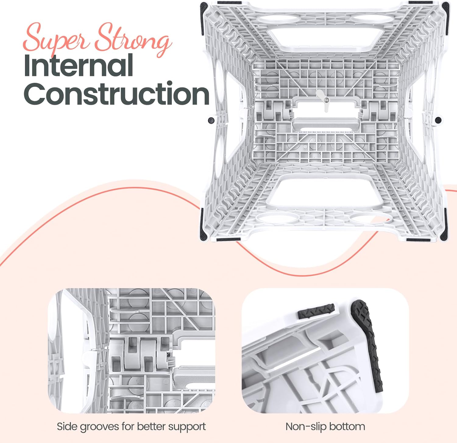 - Safe and Secure Stool: moving handle,rubber foot grips and non-slip surface points provide excellent traction for the collapsible folding step stool; smooth rounded edges also help prevent bumps and bruises. All these improvements are made solely to ensure your body safety