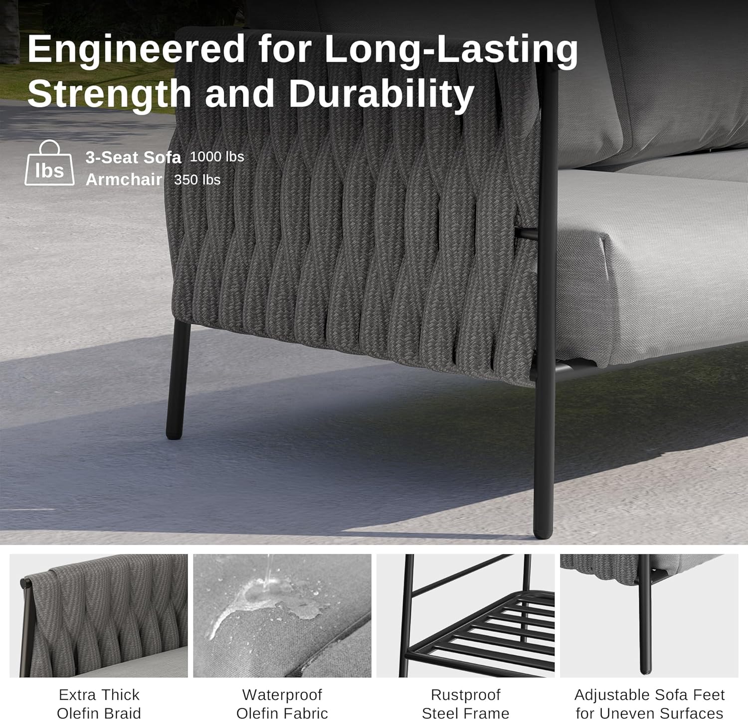 - PREMIUM MATERIAL FOR LASTING USE: The side material is constructed from woven Olefin rope to deliver a modern, long-lasting look. The Olefin cushion covers come with a TPU coating treatment and are stitched with waterproof Teslin. Compared with ordinary rattan materials, the Olefin fabric is thoughtfully crafted and built to withstand extreme weather, delivers improved wear resistance, and good color fastness to meet the outdoor use requirements of all four seasons