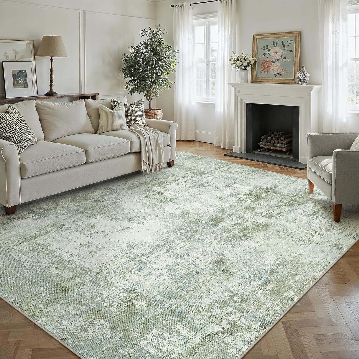 8x10 Washable Area Rug Green Modern Neutral Abstract Living Room Bedroom Indoor Floor Carpet Low Pile Soft Non-Slip Lightweight Vacuumable Large Throw Rug for Nursery Dining Room