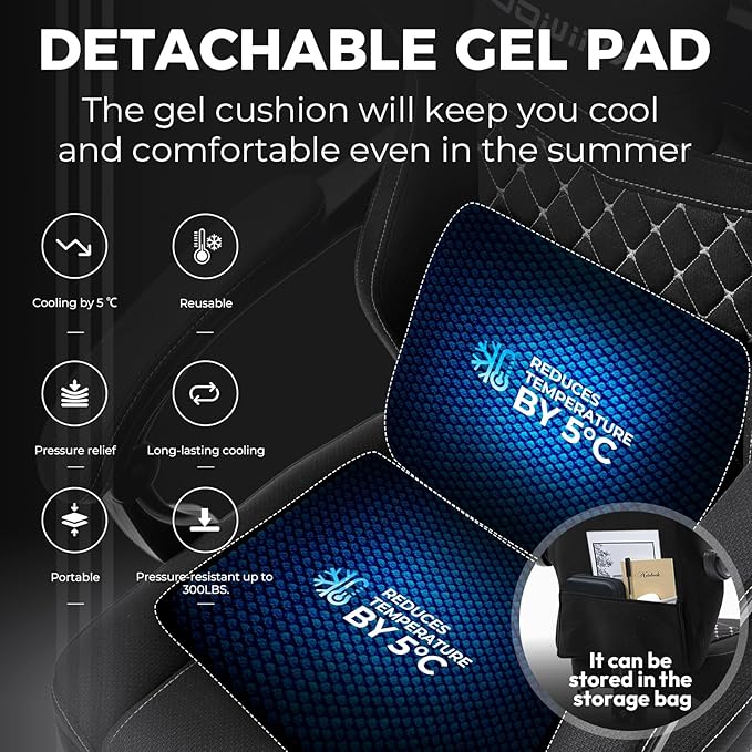 - Dual Cooling System for All-Day Freshness:Stay cool with advanced breathable tech fabric (no sweaty PU leather!) paired with a detachable gel-infused cushion. Place it on the seat or lumbar pillow to minimize heat buildup and keep airflow optimal, even during intense marathons.