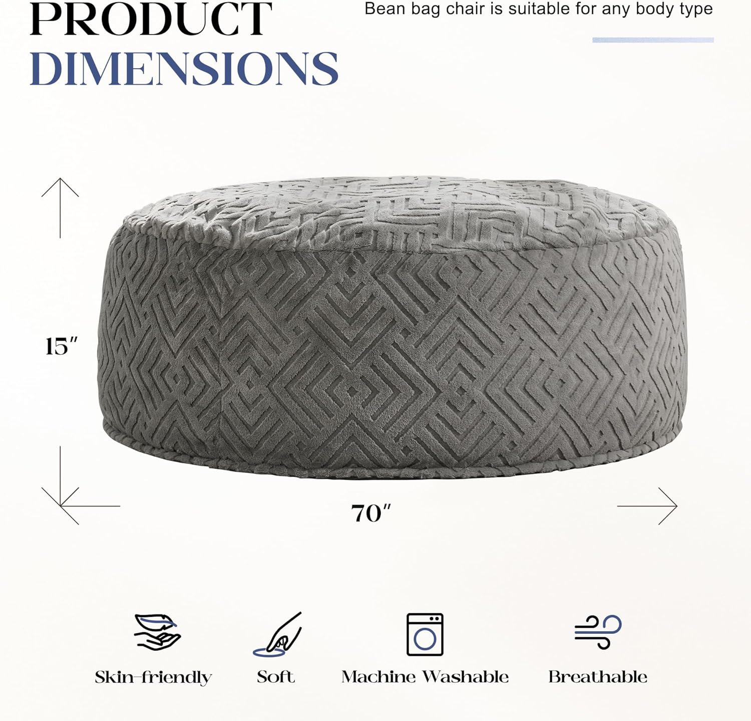 Hobestluk Bean Bag Chairs Adults Beanbag Chair with Filler Large Bean Bags with Fluffy Embossed Cover, Giant Bean Bag Chairs for Adults (Grey, 6FT - 70" x 70" x 15")