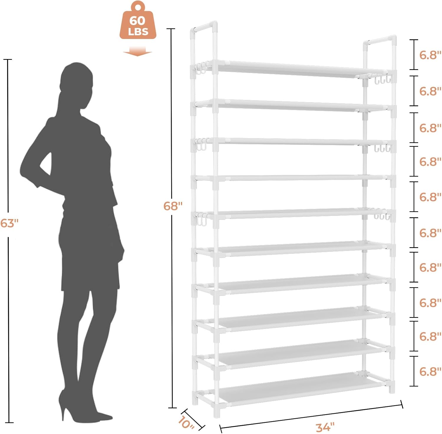 - Space Saving Shoe Rack: Size of shoe storage: 34"W x 10"D x 68"H, the floor space is only 0.22m³, free standing shoe racks takes advantage of vertical space, giving an open feel to the space. The large shoe rack perfect for closet, front door entrance, dorm, hallway