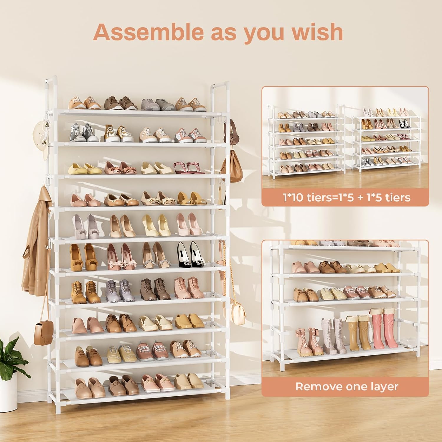 - Detachable and Stackable Shoe Rack: The shoe rack for entryway can also remove one tier layer to increase the height of the layers to accommodate different types of shoes. And you can assemble into two 5 tier shoe rack or other, can DIY shoe stand according to your needs
