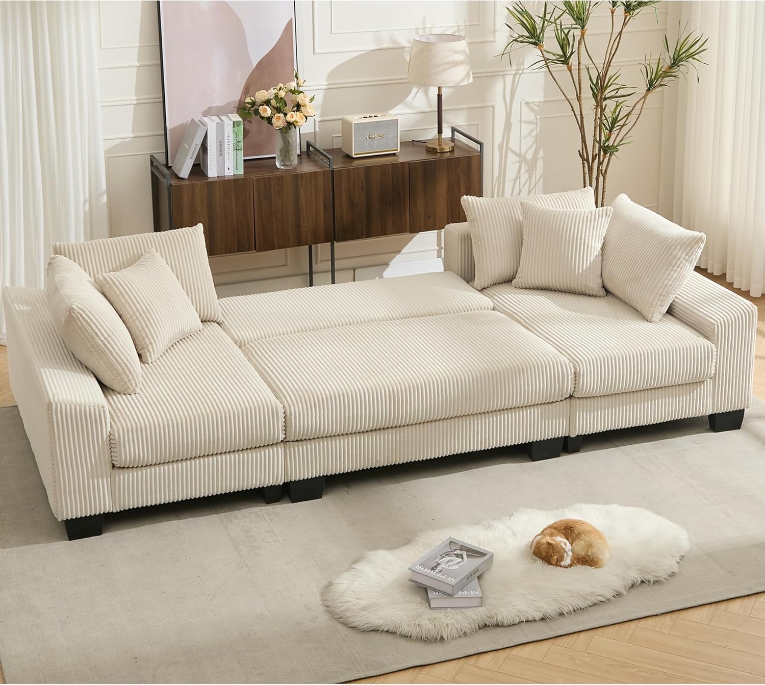 Symmetrical U Shaped Sectional Sofa Convertible Pull Out Sleeper Sofabed with Double Chaise Daybed , Corduroy Upholstered U Shaped Lounge Sofa Couch Bed w/ Throw Pillows for Living Room Apartment