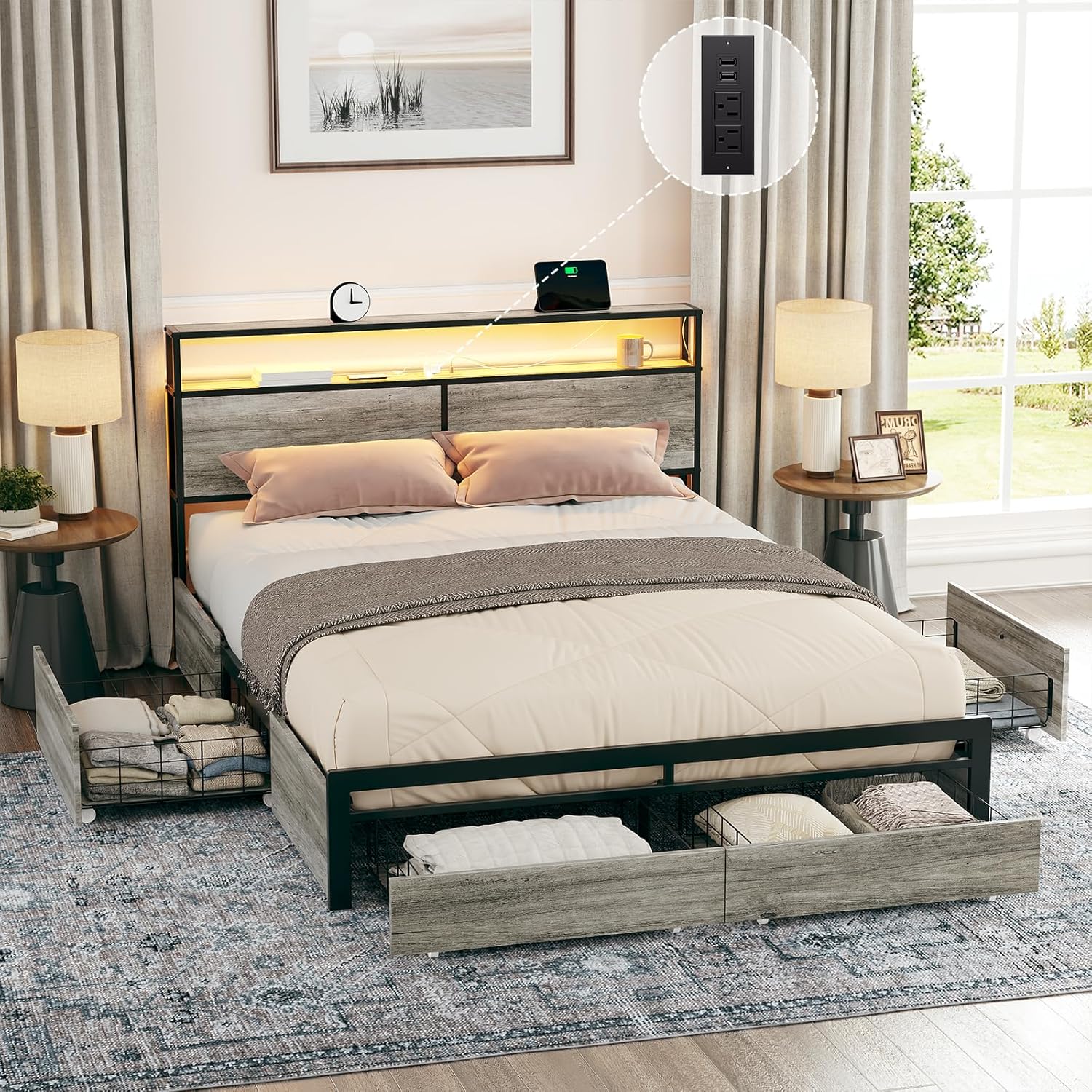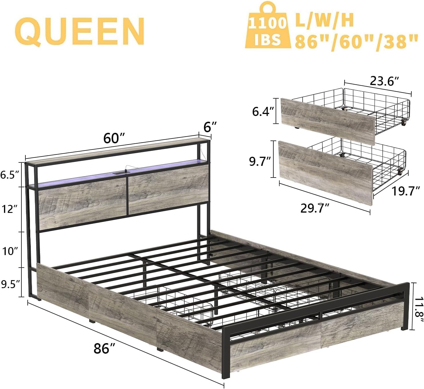 Queen Size Bed Frame with Storage Headboard and 4 Drawers LED Lighting Sturdy Metal Slat Support Non-Slip Noise-Free Platform No Box Spring Needed Greige