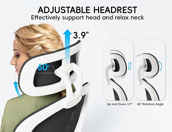 - Adjustable 3D Headrest for Neck & Shoulder Reliefļ¼Customize your comfort with our 3D adjustable headrest, designed to cradle your neck and shoulders in the ideal position. Tilt, height, and angle adjustments ensure proper alignment, reducing strain from hours at your desk. Finally, a chair that cares for your posture as much as you do