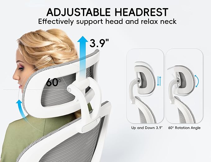 - Adjustable 3D Headrest for Neck & Shoulder Reliefļ¼Customize your comfort with our 3D adjustable headrest, designed to cradle your neck and shoulders in the ideal position. Tilt, height, and angle adjustments ensure proper alignment, reducing strain from hours at your desk. Finally, a chair that cares for your posture as much as you do
