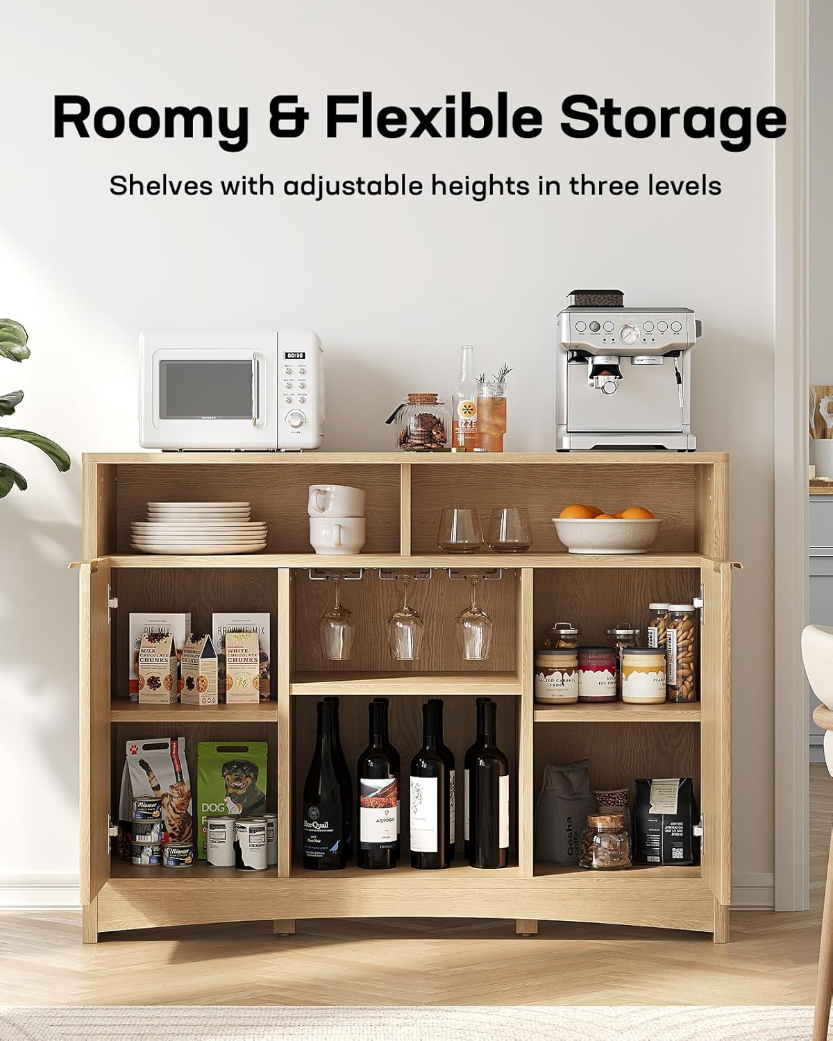 - Plenty of Flexible Storage: Designed to customize your storage, this bar cabinet features two shelves and six spacious compartments with adjustable shelves that can be set at three different levels. The middle rack includes three wine glass holders, allowing you to store up to nine glasses, and the 47.2" wide top is great for a coffee maker, microwave oven, or other kitchen essentials.