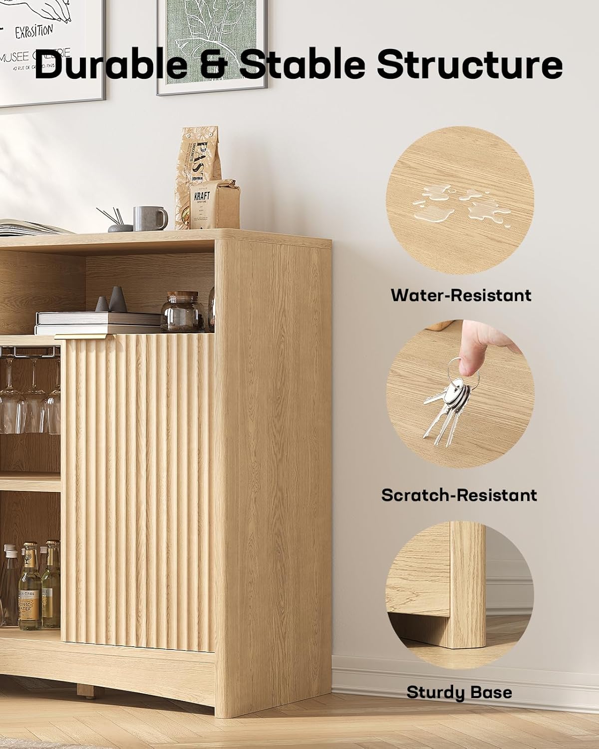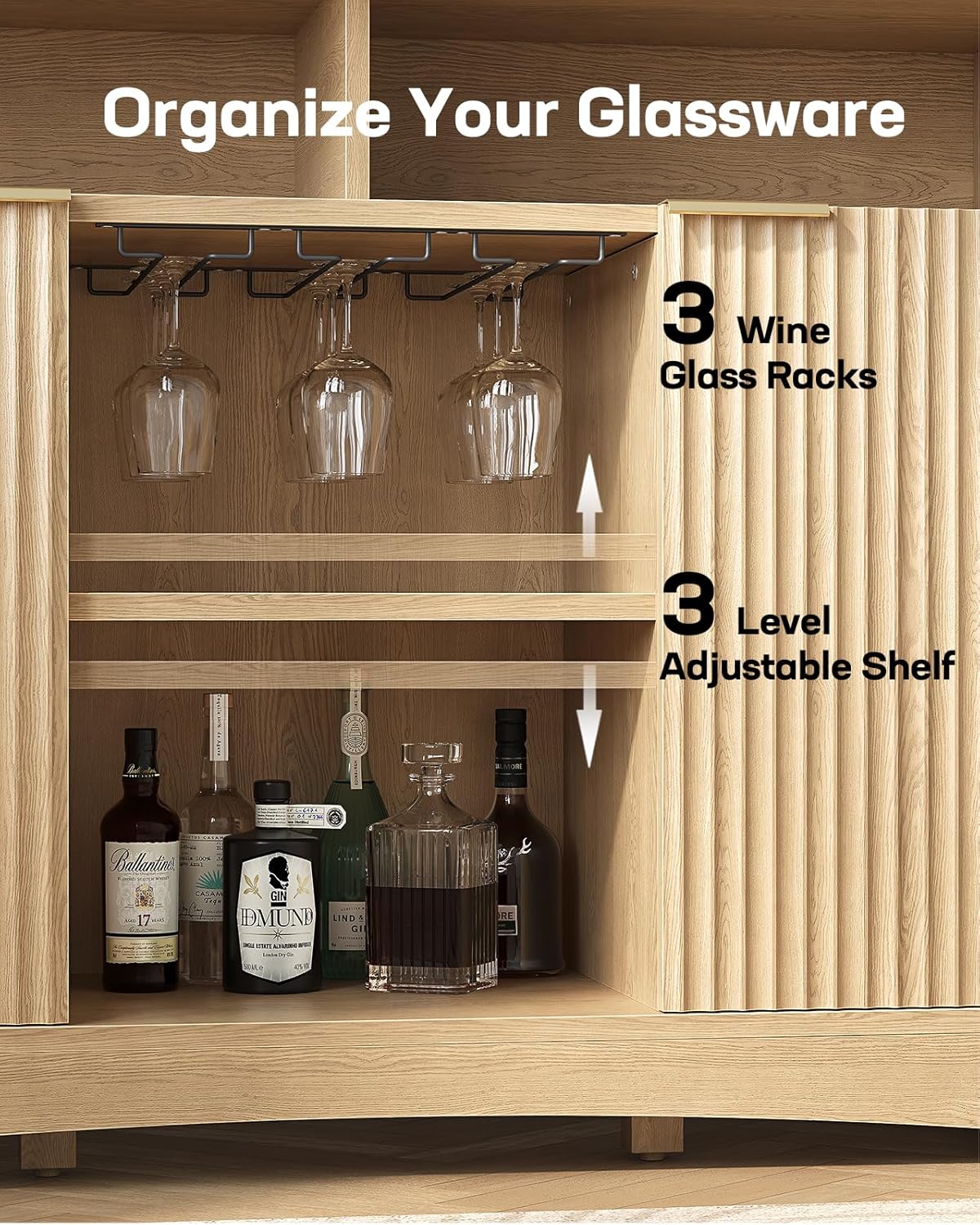 - Elegant and Contemporary Design: Engineered with an exquisite fluted panel design, this wine bar cabinet effortlessly enhances any space with its modern charm and artistic flair. Whether placed in your living room, dining area, or kitchen, it serves as both a functional storage solution and a stylish statement piece.