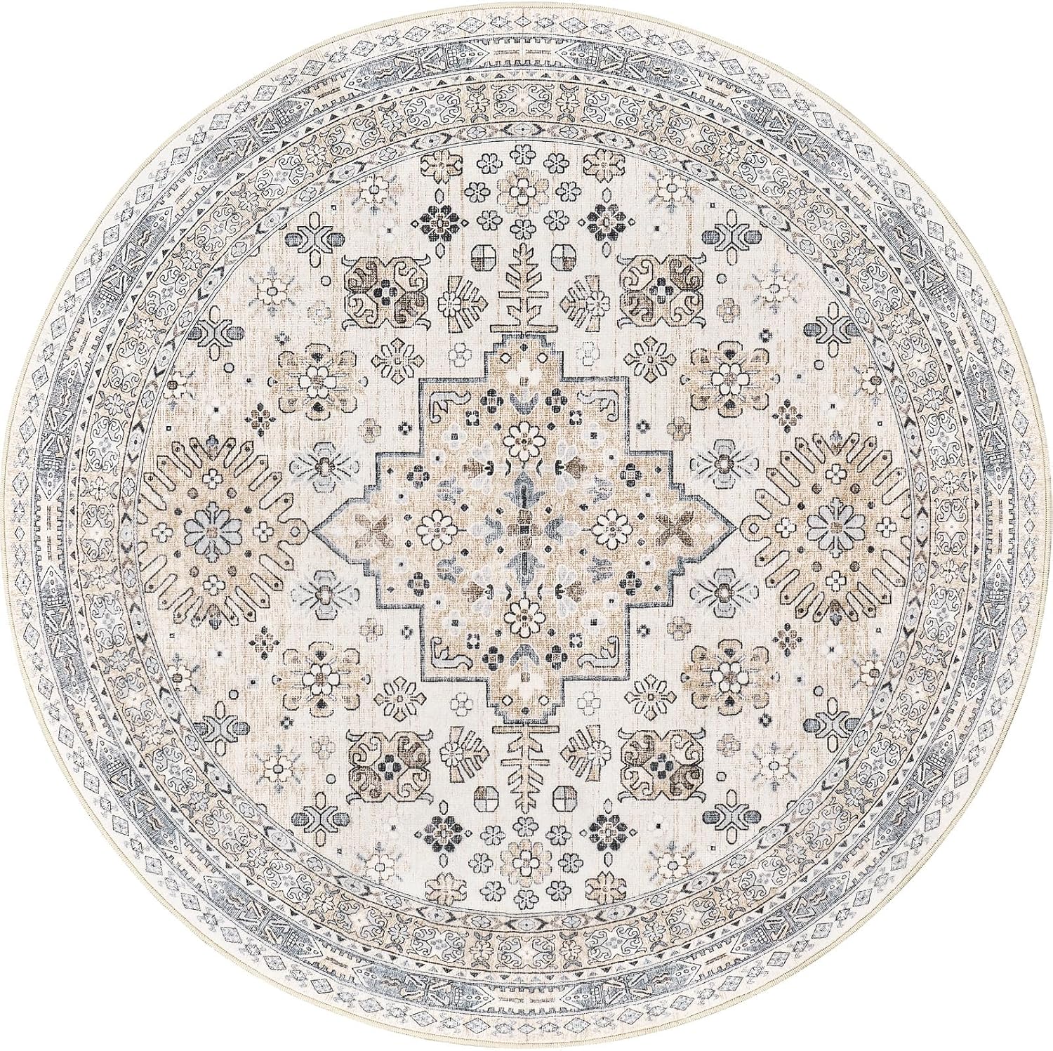 zesthome 9ft Round Rugs for Living Room, Non-Slip Washable Round Area Rugs, Ultra-Thin Large Circle Rugs, Soft Low Pile Rug for Bedroom, Kitchen - Vintage Stain Resistant Round Rug (Beige,9'x9')