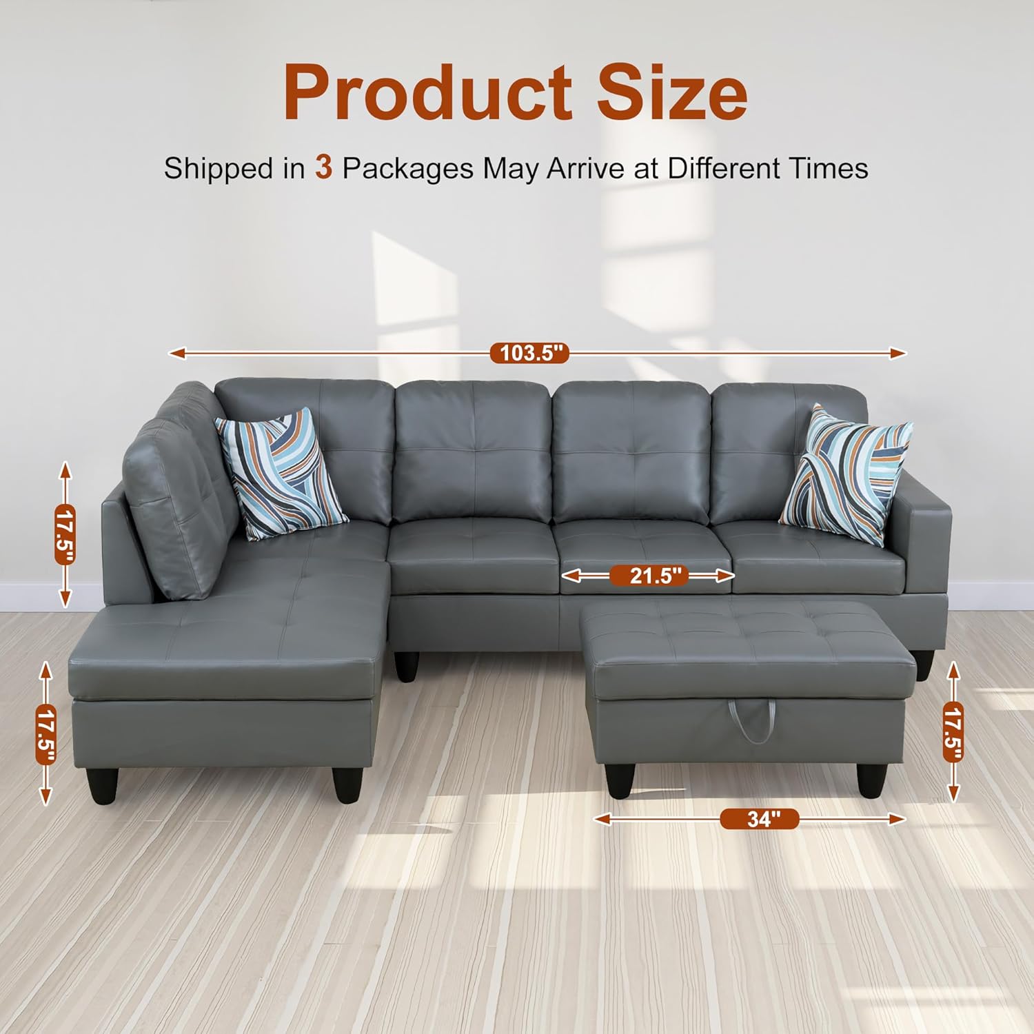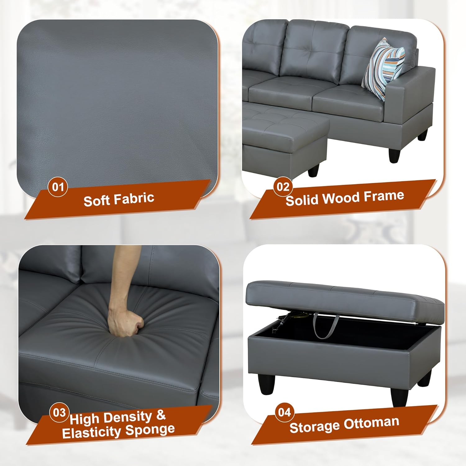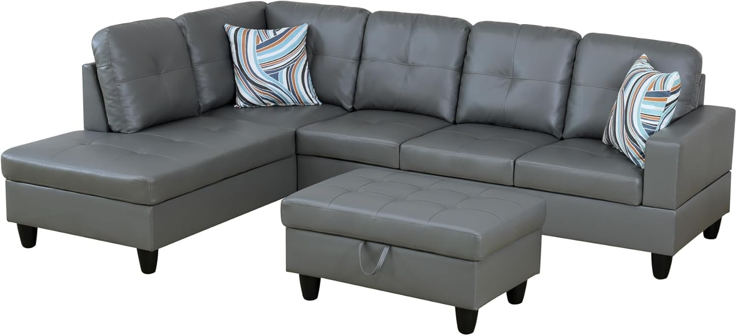 - Adaptable and Functional Layout: The chaise lounge configuration offers flexibility in your seating arrangement, allowing you to arrange the sofa to suit your space. The included storage ottoman adds practicality, providing a convenient solution for keeping your living area tidy and organized.