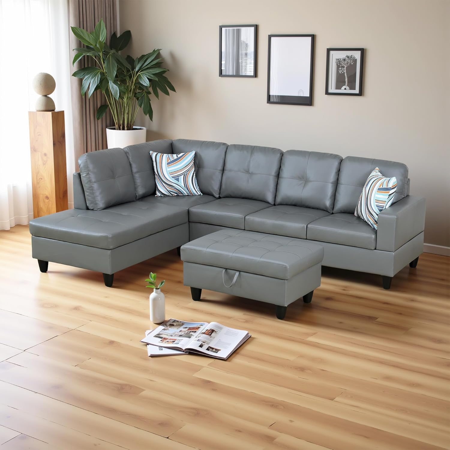 Osparple L Shaped Couch PU Leather Sectional Couches for Living Room Upholstered 3 Pieces Modular Sectional Sofa with Chaise, Ottoman with Storage for Living Room and Small Apartment, Dark Grey