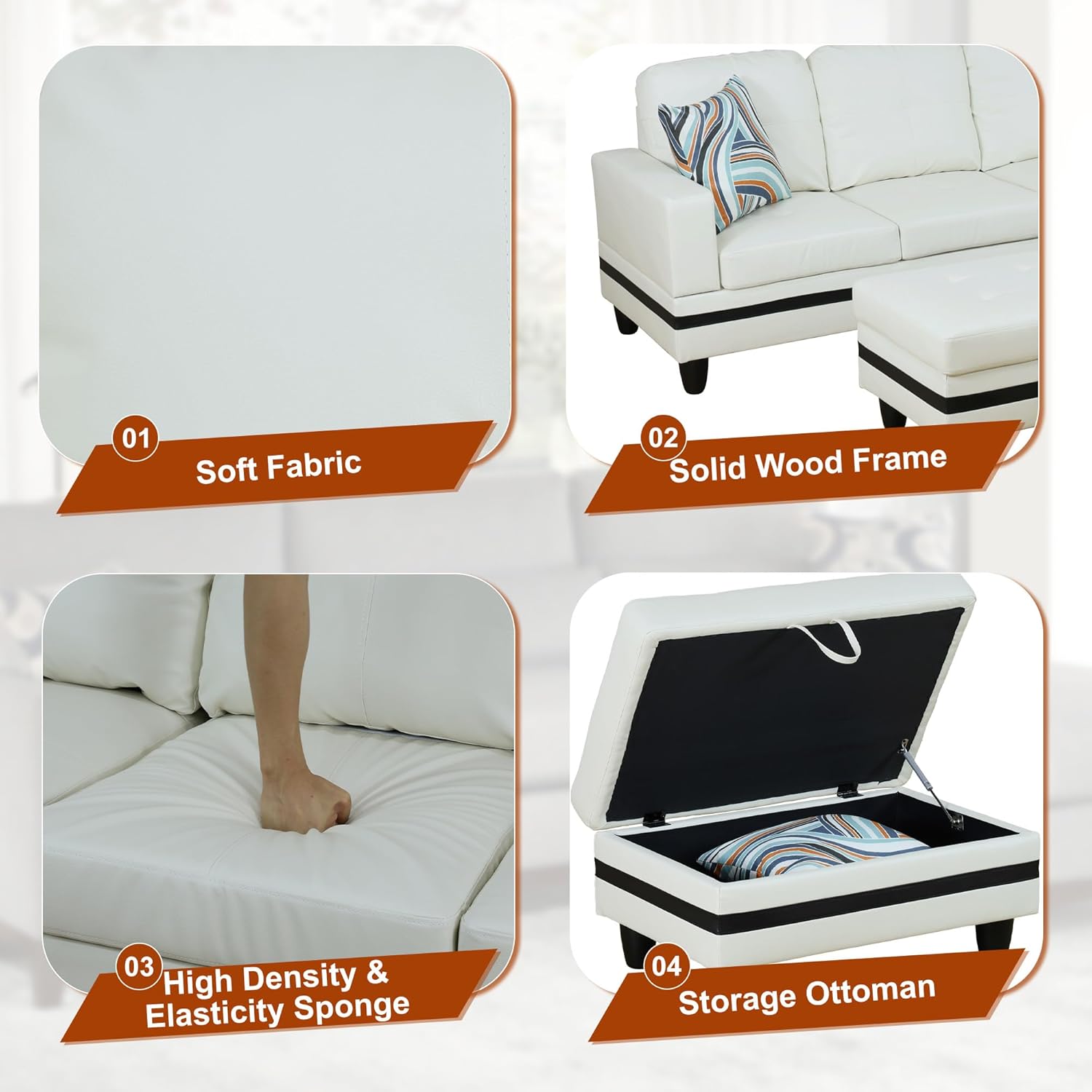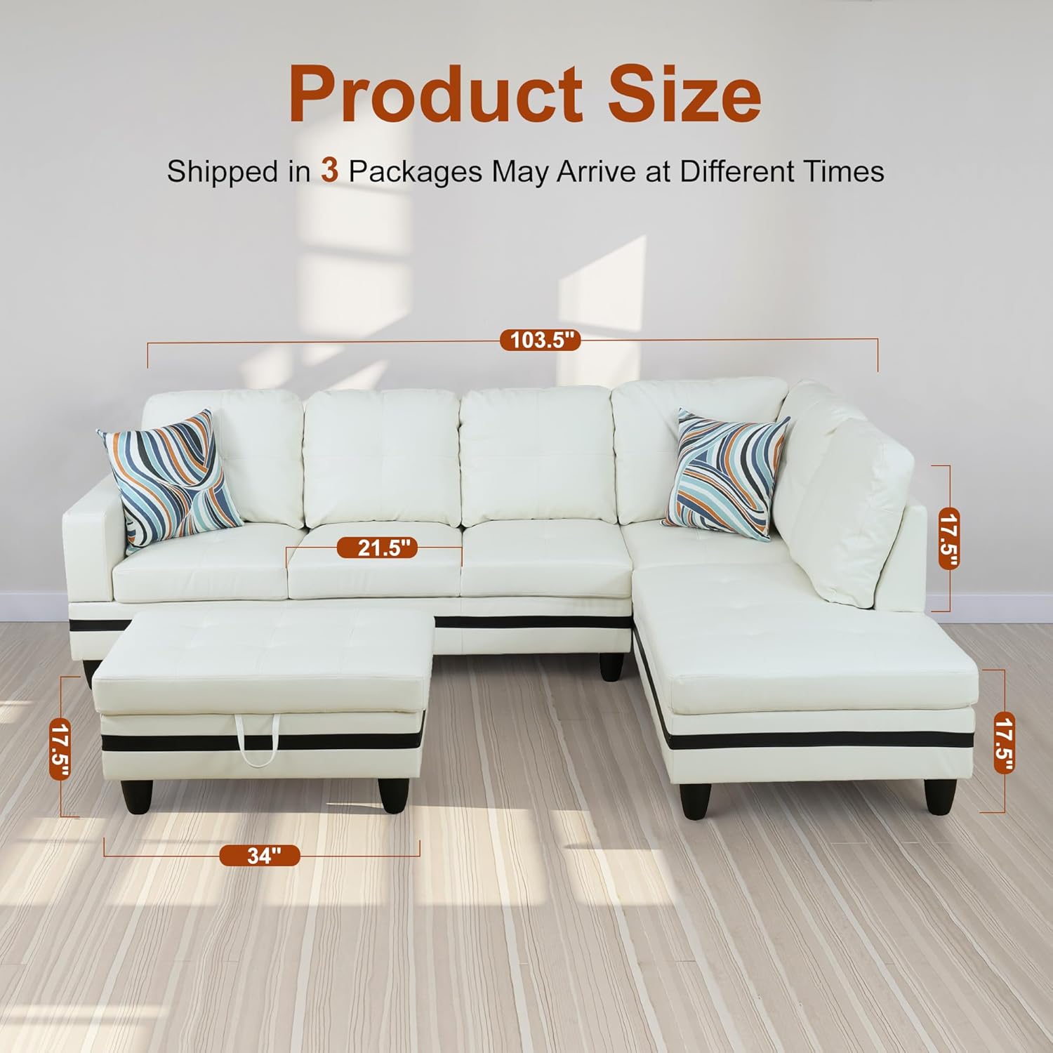 - Adaptable and Functional Layout: The chaise lounge configuration offers flexibility in your seating arrangement, allowing you to arrange the sofa to suit your space. The included storage ottoman adds practicality, providing a convenient solution for keeping your living area tidy and organized.