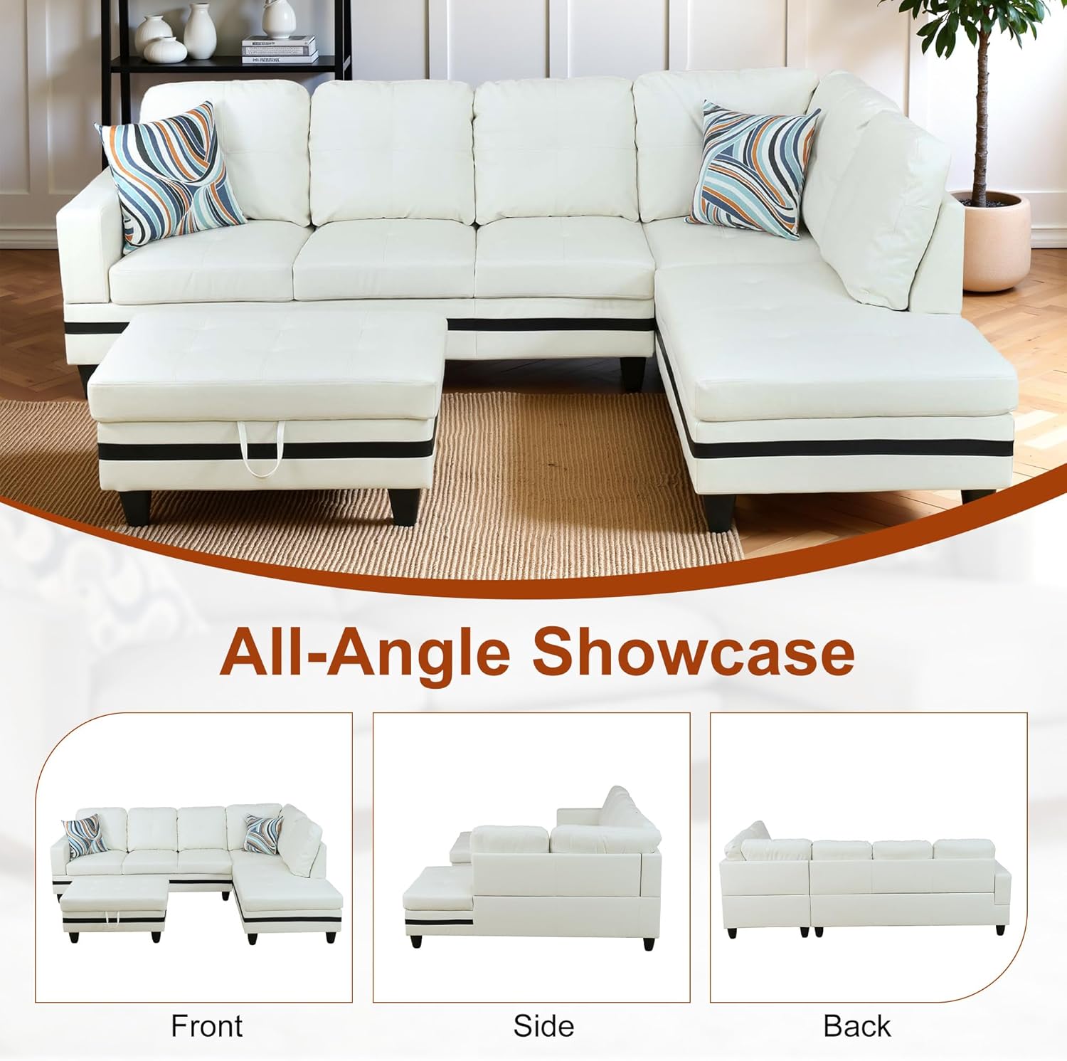 Osparple L Shaped Couch PU Leather Sectional Couch Upholstered 3 Pieces Sofas for Living Room with Chaise, Ottoman with Storage for Office and Small Apartment, Black and White