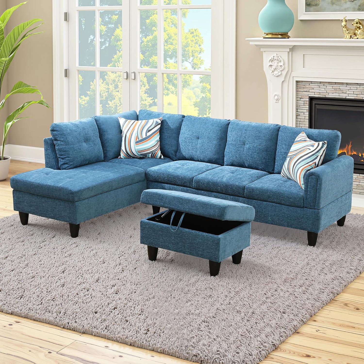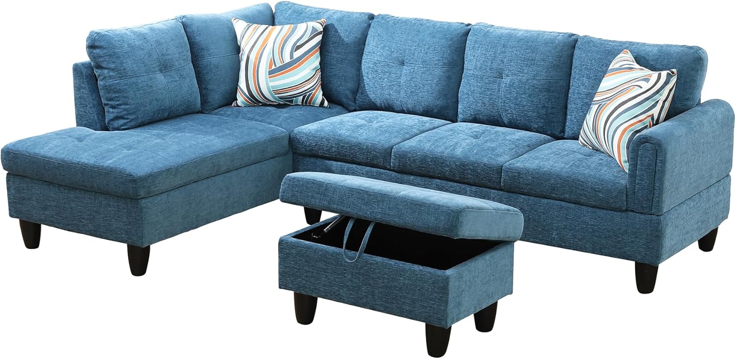 Osparple L Shaped Couch Sectional Couches for Living Room Upholstered Flannel 3 Pieces Modular Sectional Sofa with Chaise, Ottoman with Storage for Living Room and Small Apartment, Blue