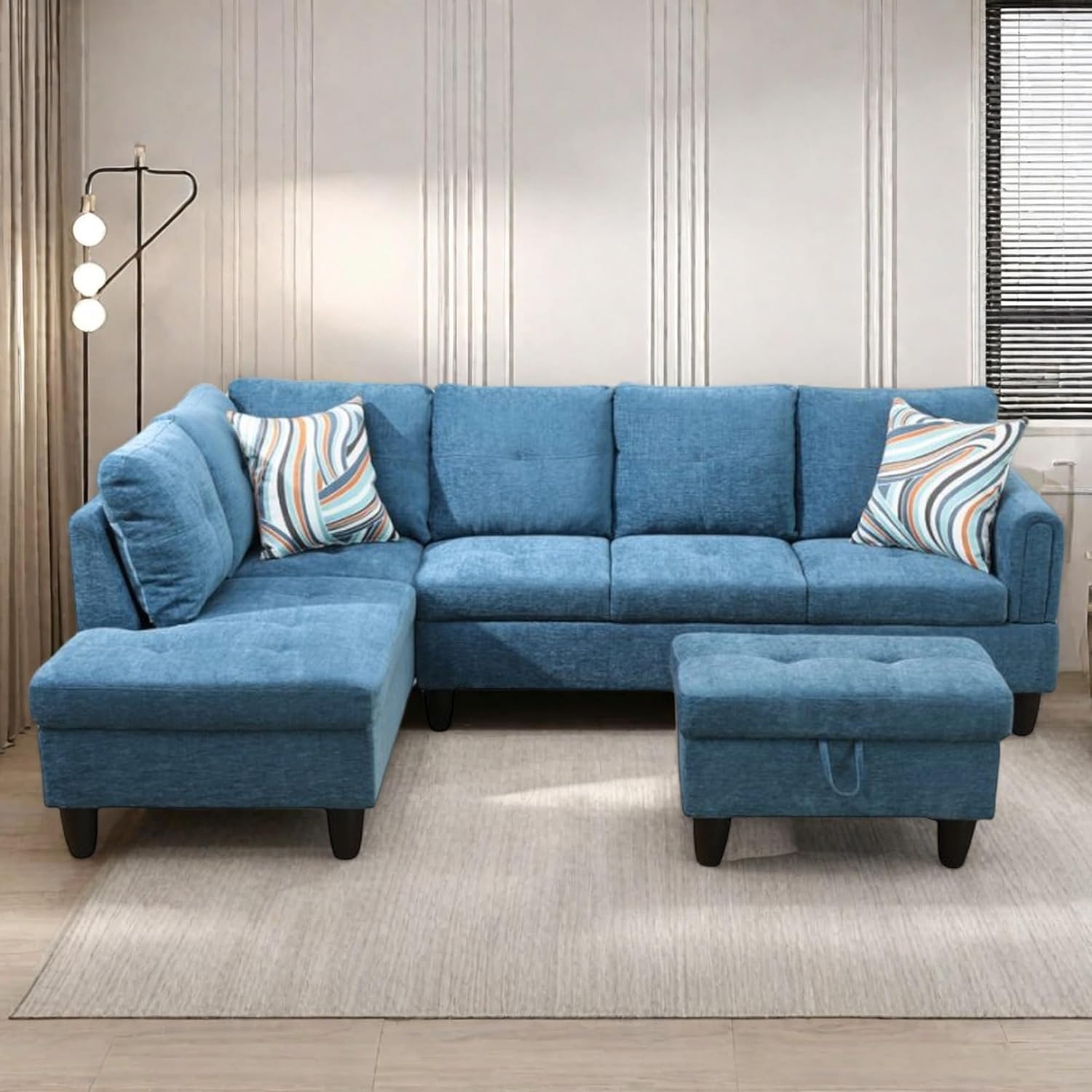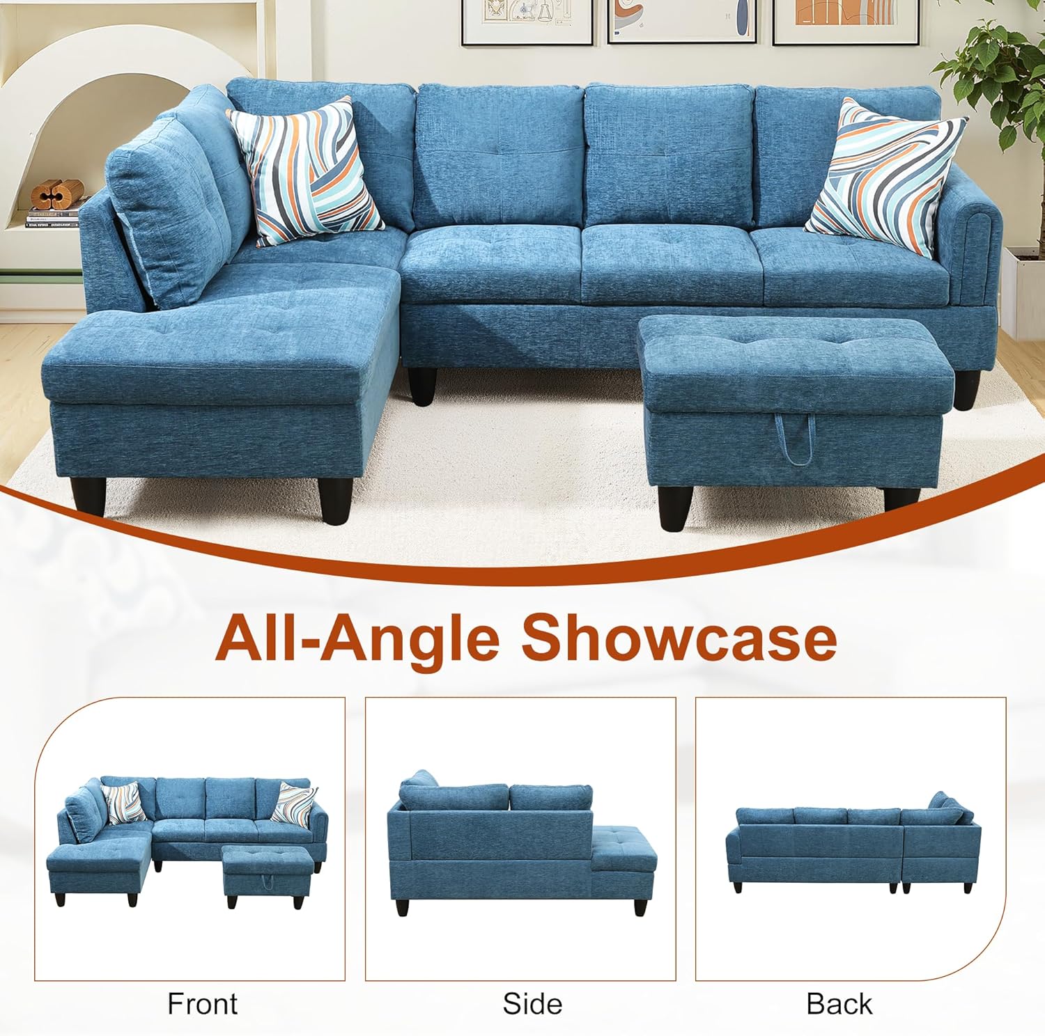 - Adaptable and Functional Layout: The chaise lounge configuration offers flexibility in your seating arrangement, allowing you to arrange the sofa to suit your space. The included storage ottoman adds practicality, providing a convenient solution for keeping your living area tidy and organized.