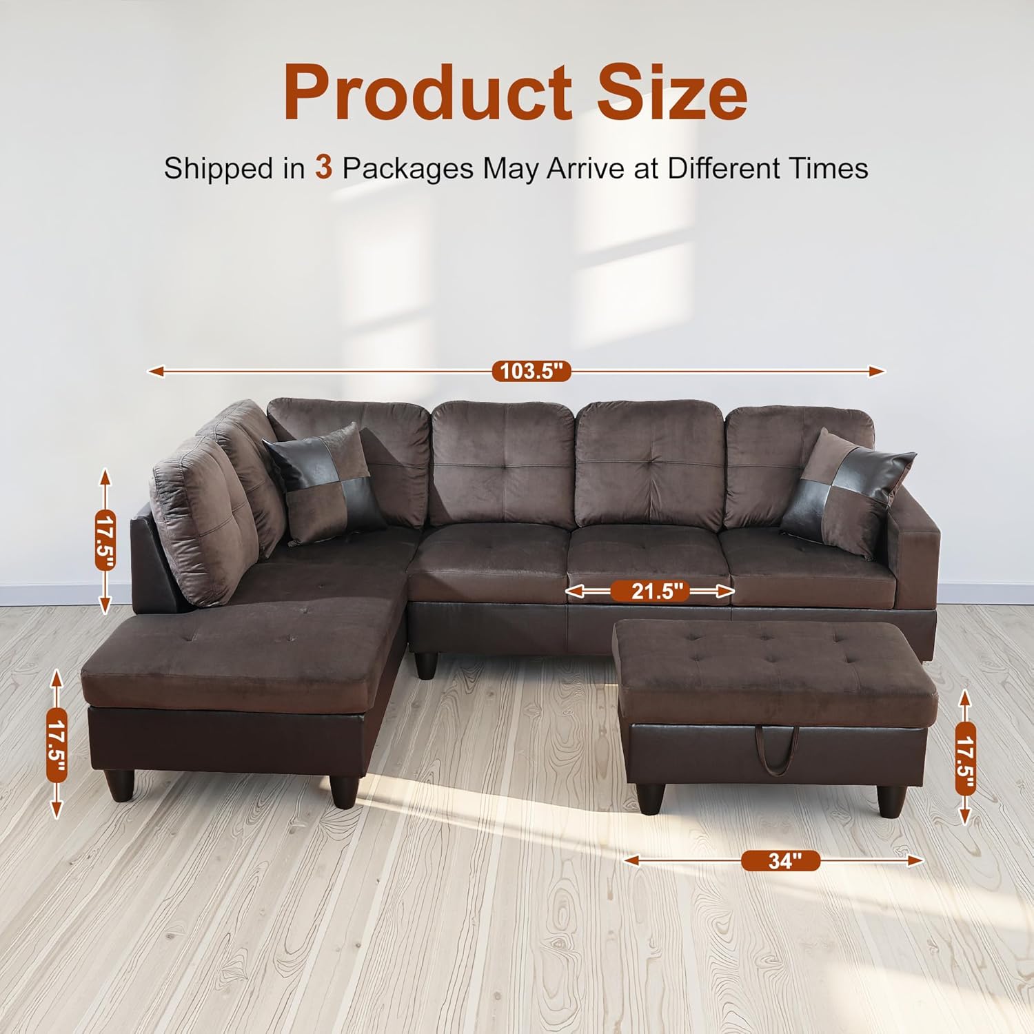 - Adaptable and Functional Layout: The chaise lounge configuration offers flexibility in your seating arrangement, allowing you to arrange the sofa to suit your space. The included storage ottoman adds practicality, providing a convenient solution for keeping your living area tidy and organized.