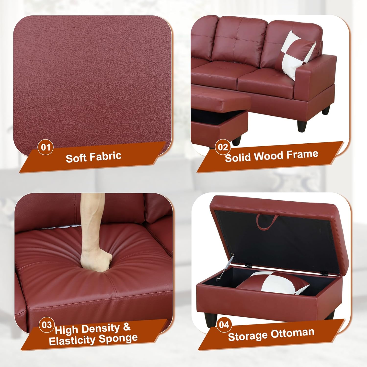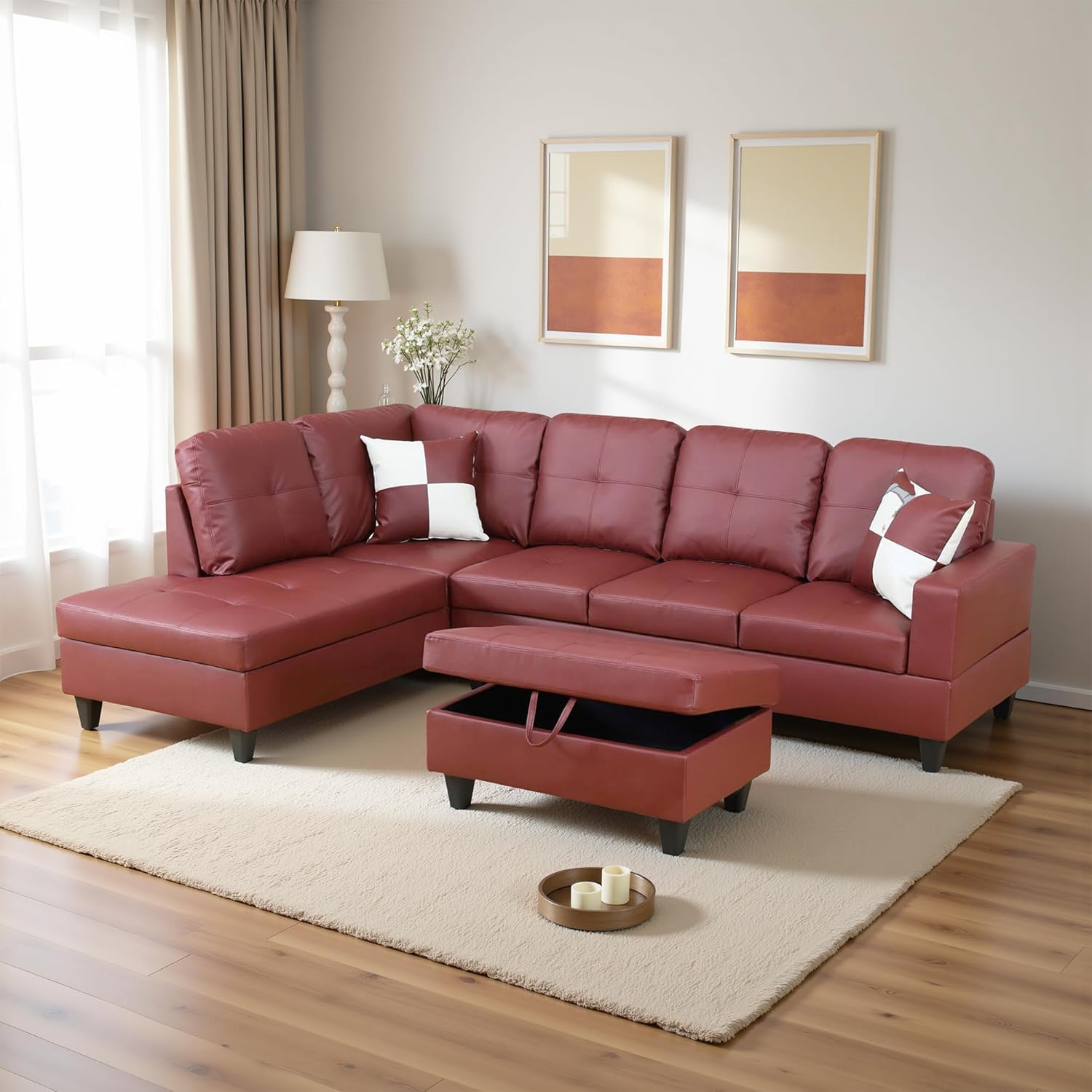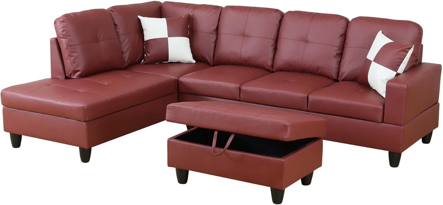 Osparple L Shaped Couch Faux Leather Sectional Couches for Living Room Upholstered 3 Pieces Modular Sectional Sofa with Chaise, Ottoman with Storage for Living Room and Small Apartment, Dark Red