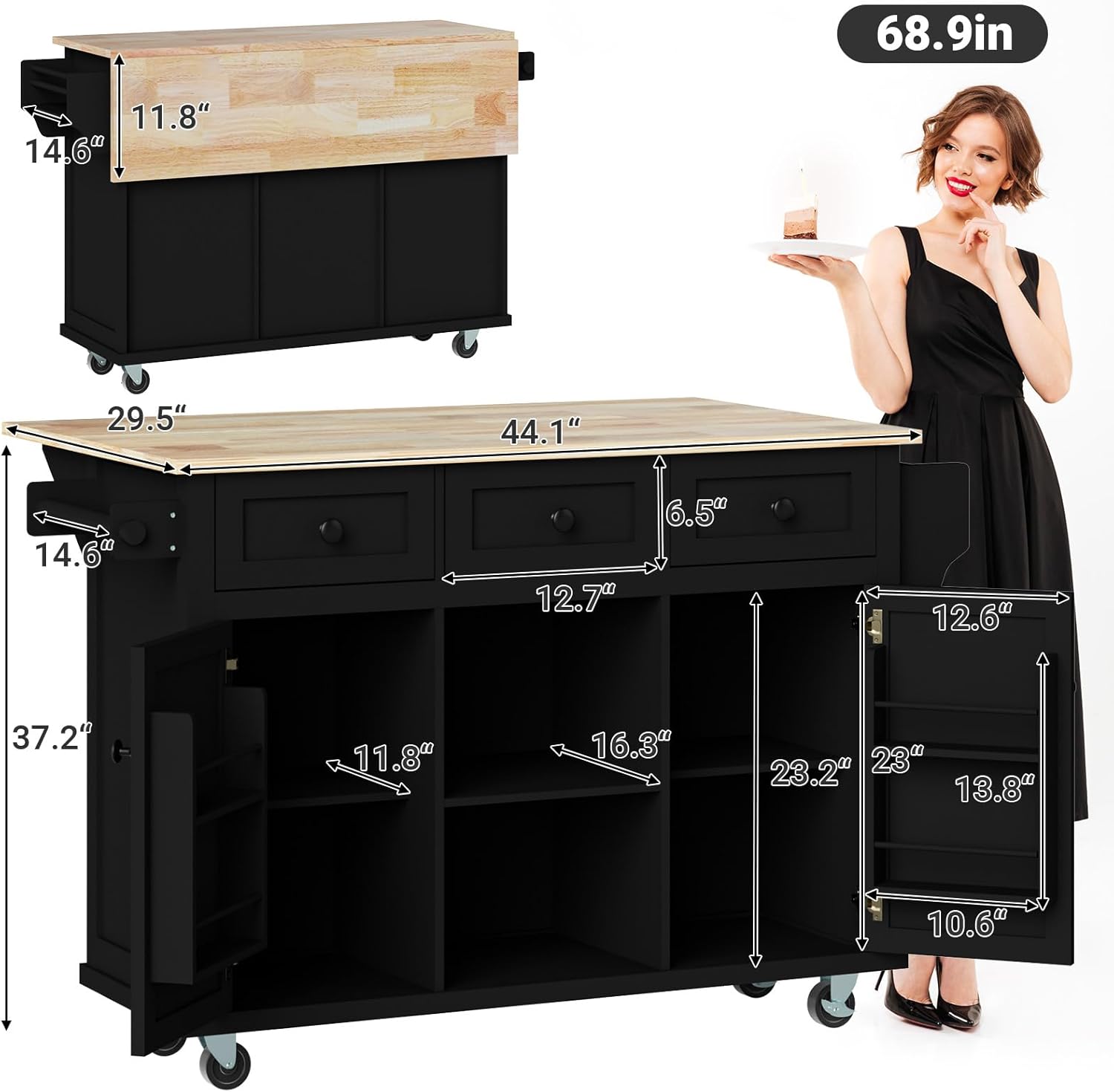 Rovibek Kitchen Island with Drawers 53 in Rolling Island Cart Mobile Solid Wood Portable Islands on Wheels with Storage Cabinet & Drawers, Black
