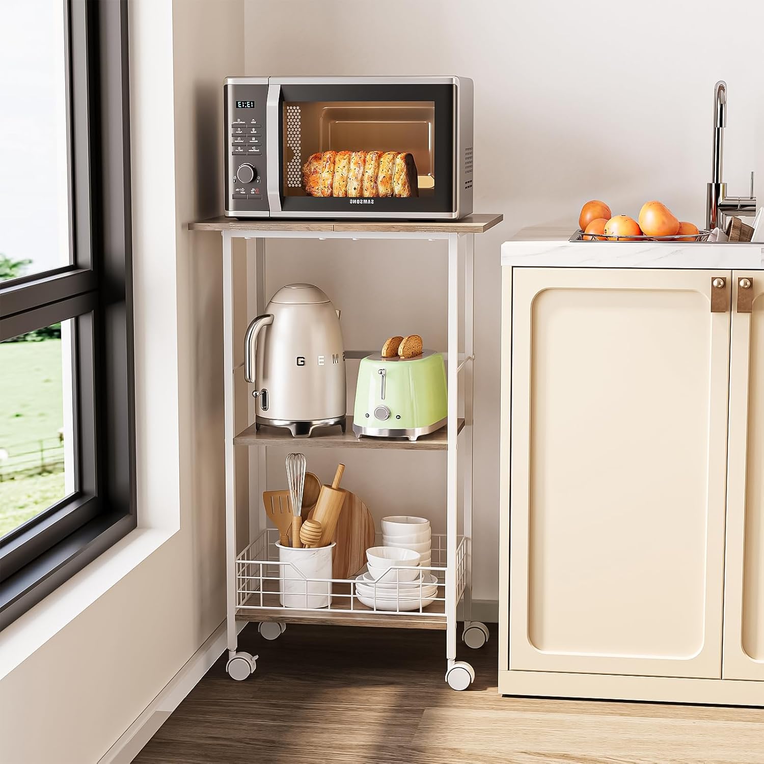 - 🔹【Spacious & Multi-Purpose Storage】This white microwave cart with storage features a 3-tier rolling cart design, providing ample space for your microwave stand, kitchen essentials, coffee cart station, and more. The sturdy kitchen cart with storage helps keep your countertops clutter-free while maximizing efficiency, making it an essential addition to any small kitchen island or kitchen carts on wheels with storage.