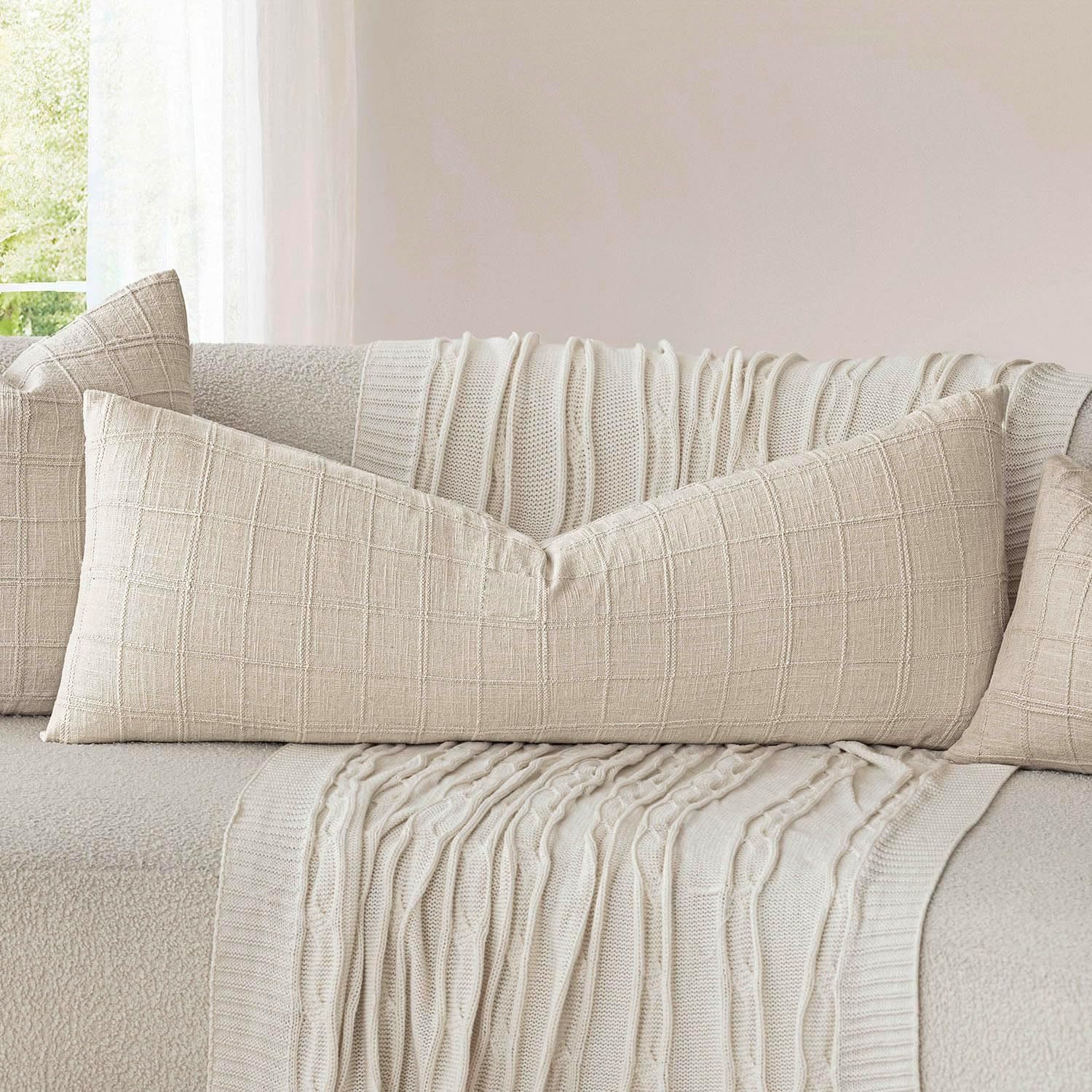 Foindtower Set of 2 Decorative Linen Check Throw Pillow Covers Neutral Long Body Lumbar Cushion Covers Farmhouse Vintage Home Decor for Sofa Chair Couch Bedroom Living Room,14×36 Inch,Natural Beige