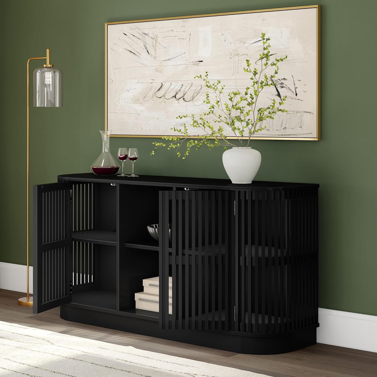 - Smart Storage: Contemporary sideboard cabinet features an open middle shelf and two push-to-open doors that open to reveal adjustable shelves with three height options, giving you flexible storage for anything from dishware to coffee bar must-haves.