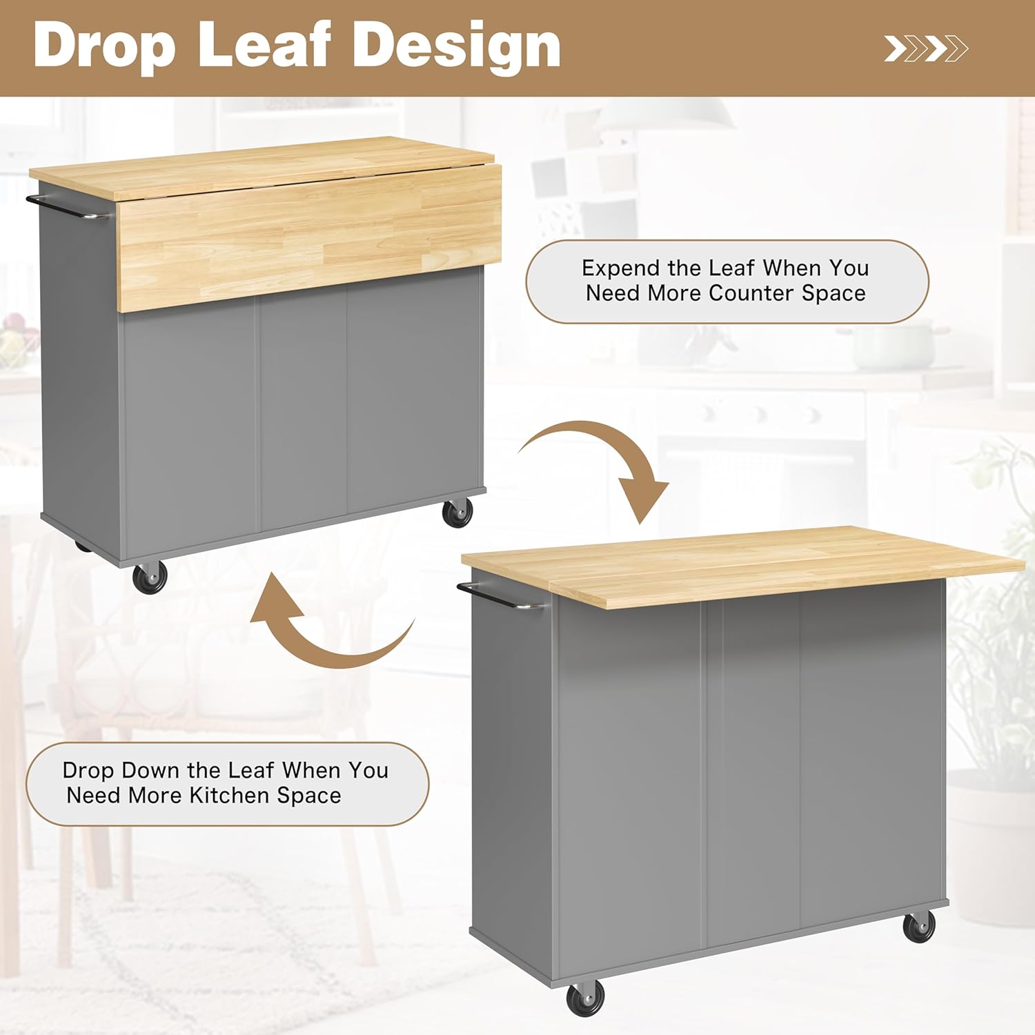 - Flexible Mobile Dining Bar: Featuring a foldable drop leaf, this island cart effortlessly transforms into a convenient dining bar. Expand it whenever you require additional dining space, or simply fold it down to reduce its footprint and optimize room capacity.