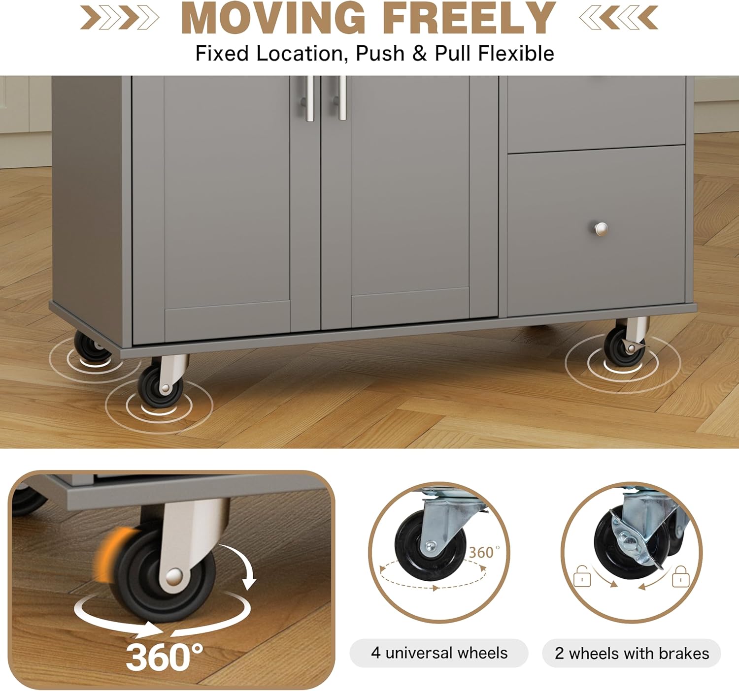 - Smooth Mobility and Secure Placement: With 5 seamless - rolling wheels, this kitchen island cart glides effortlessly. The 2 wheels with braking mechanisms ensure stable parking, allowing you to move and position it as needed, keeping everything within easy reach.