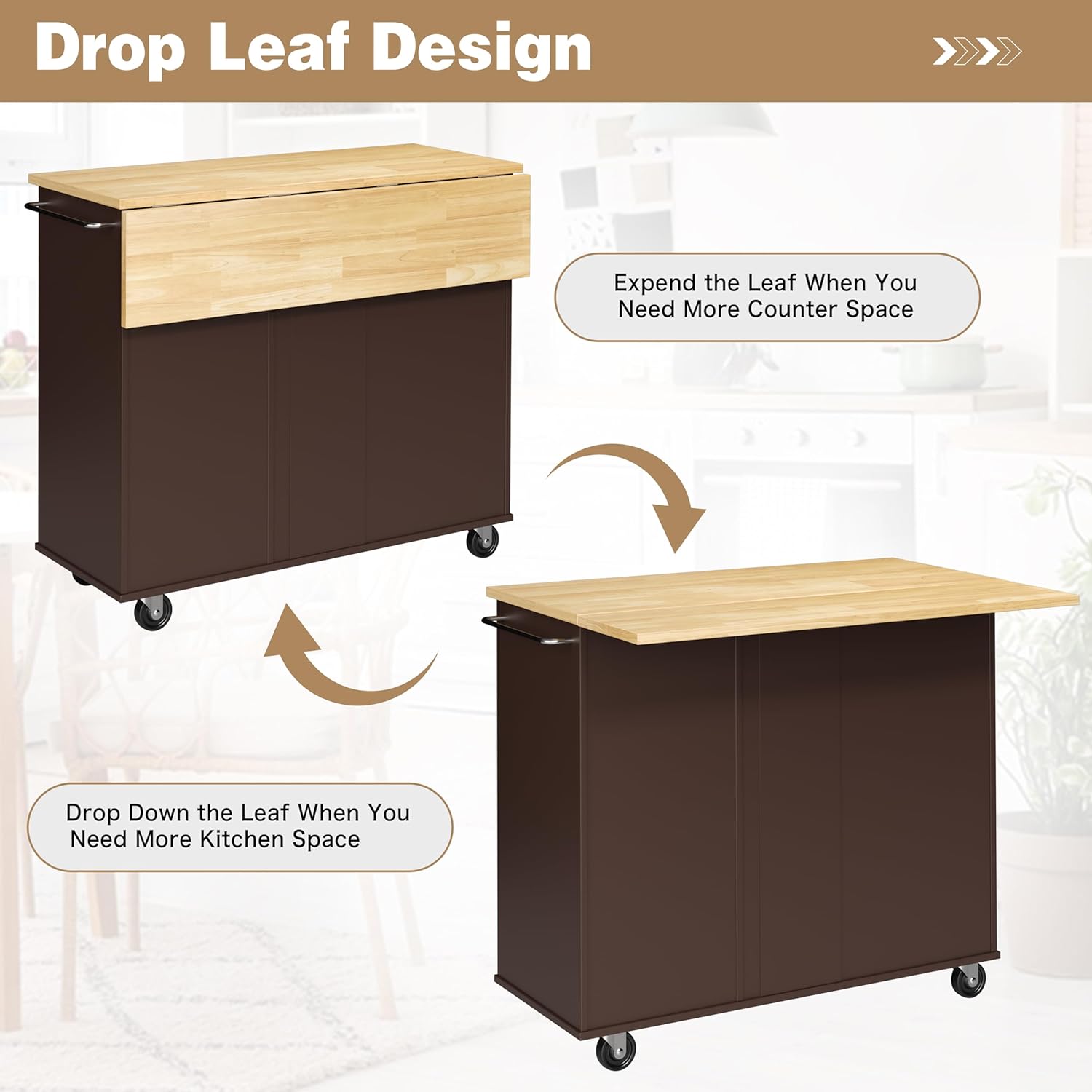 - Flexible Mobile Dining Bar: Featuring a foldable drop leaf, this island cart effortlessly transforms into a convenient dining bar. Expand it whenever you require additional dining space, or simply fold it down to reduce its footprint and optimize room capacity.