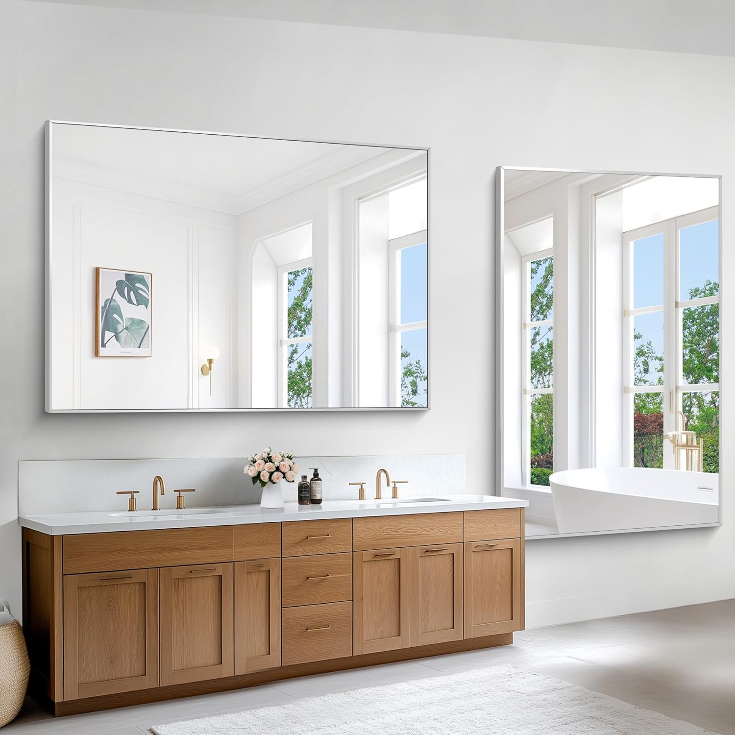 - 2 WAYS TO USE:Rectangle bathroom mirrors for wall can be used in 2 ways: 1. Horizontal (landscape) 2. Vertical hanging (portrait)