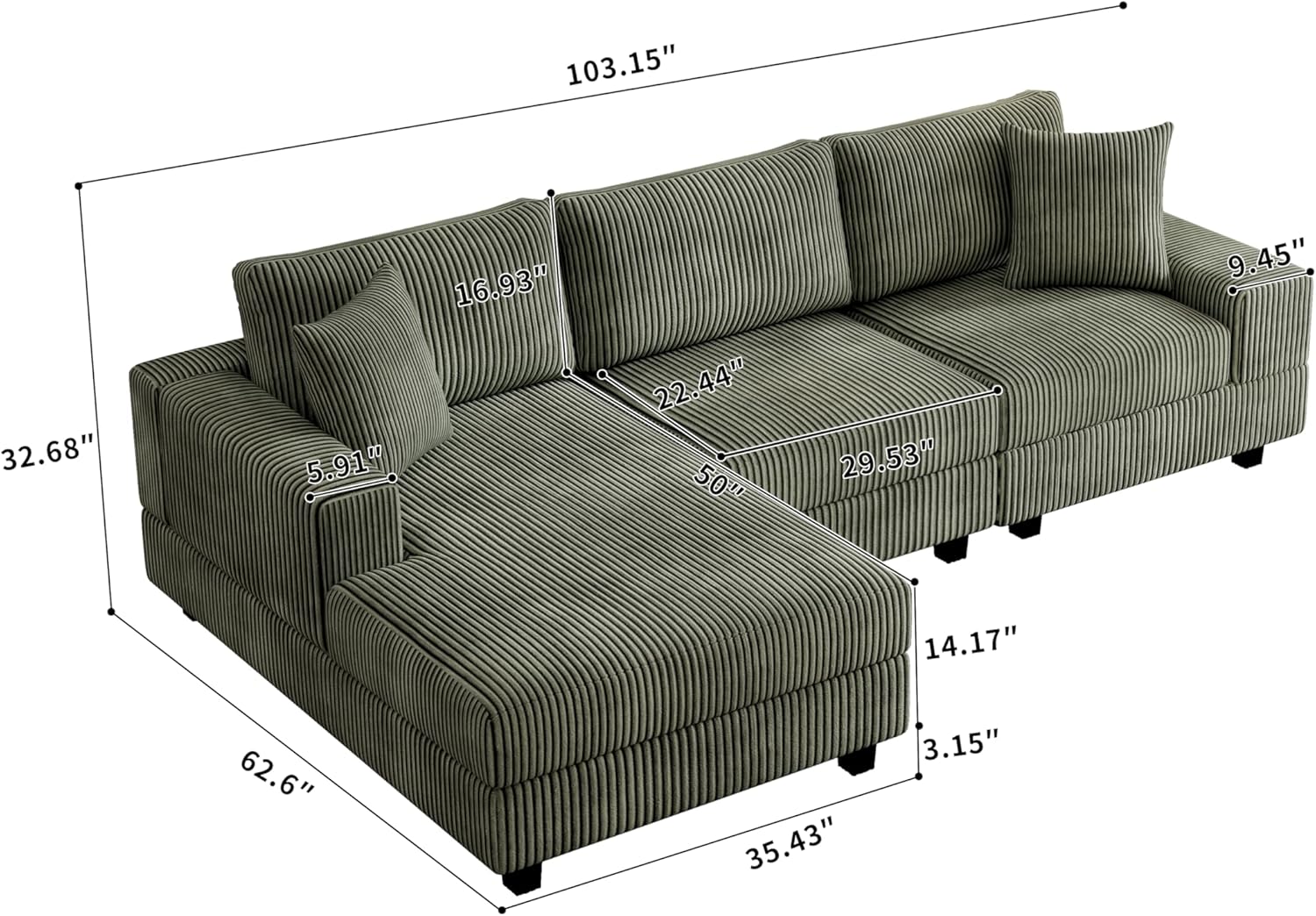 - Easy to Assemble Corner Modular Sectional Couch & 3 Packages :overall sofa size :103.15"*62.6"*32.68"H.The sofa comes with clear installation instructions, so following the steps in the manual makes it easy to complete the installation .This product comes in 3 packages, we will send 3 packages at the same time, please make sure you receive all 3 packages before installing!