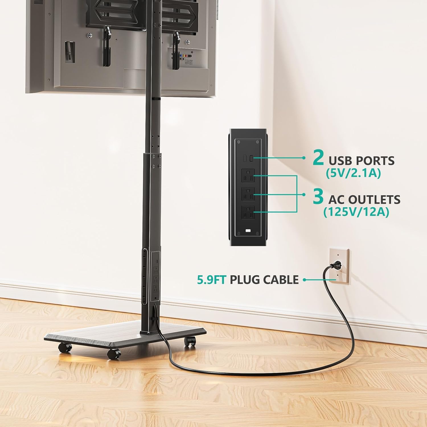 - BUILT-IN POWER HUB: Mobile TV Cart features a convenient integrated power outlet on the back, including 2 USB ports (5V/2.1A) and 3 AC outlets(125V/12A). With a 5.9ft power cord, provide easy access to power your TV, eliminating messy cords and power strips