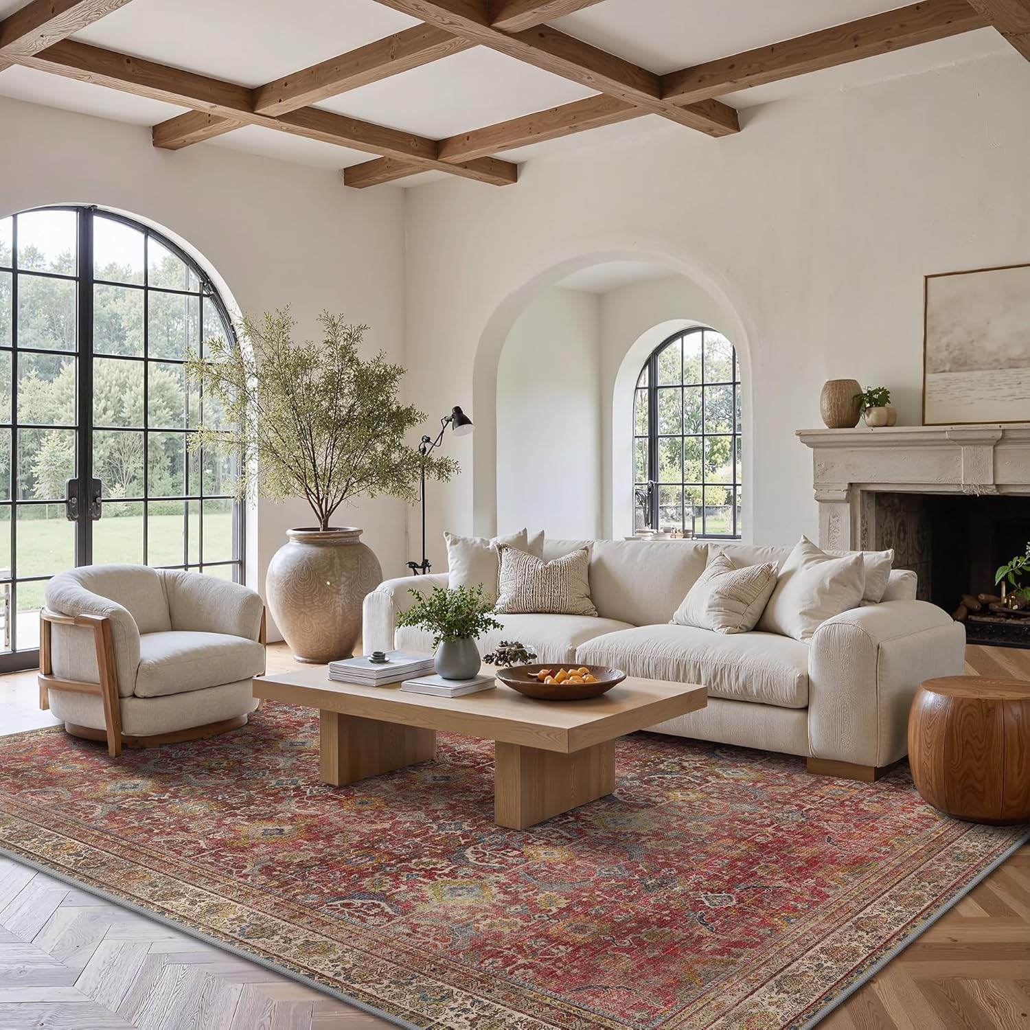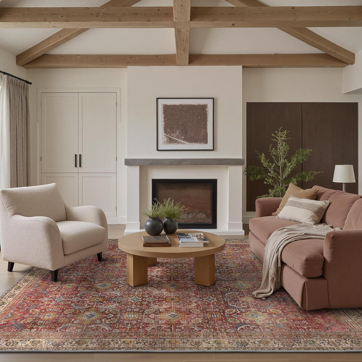 8X10 Area Rugs Machine Washable Rugs for Living Room, Vintage Boho Large Rugs for Bedroom Dining Room, Non Slip Indoor Soft Distressed Lightweight Thin Low Pile Carpet, Rust Red