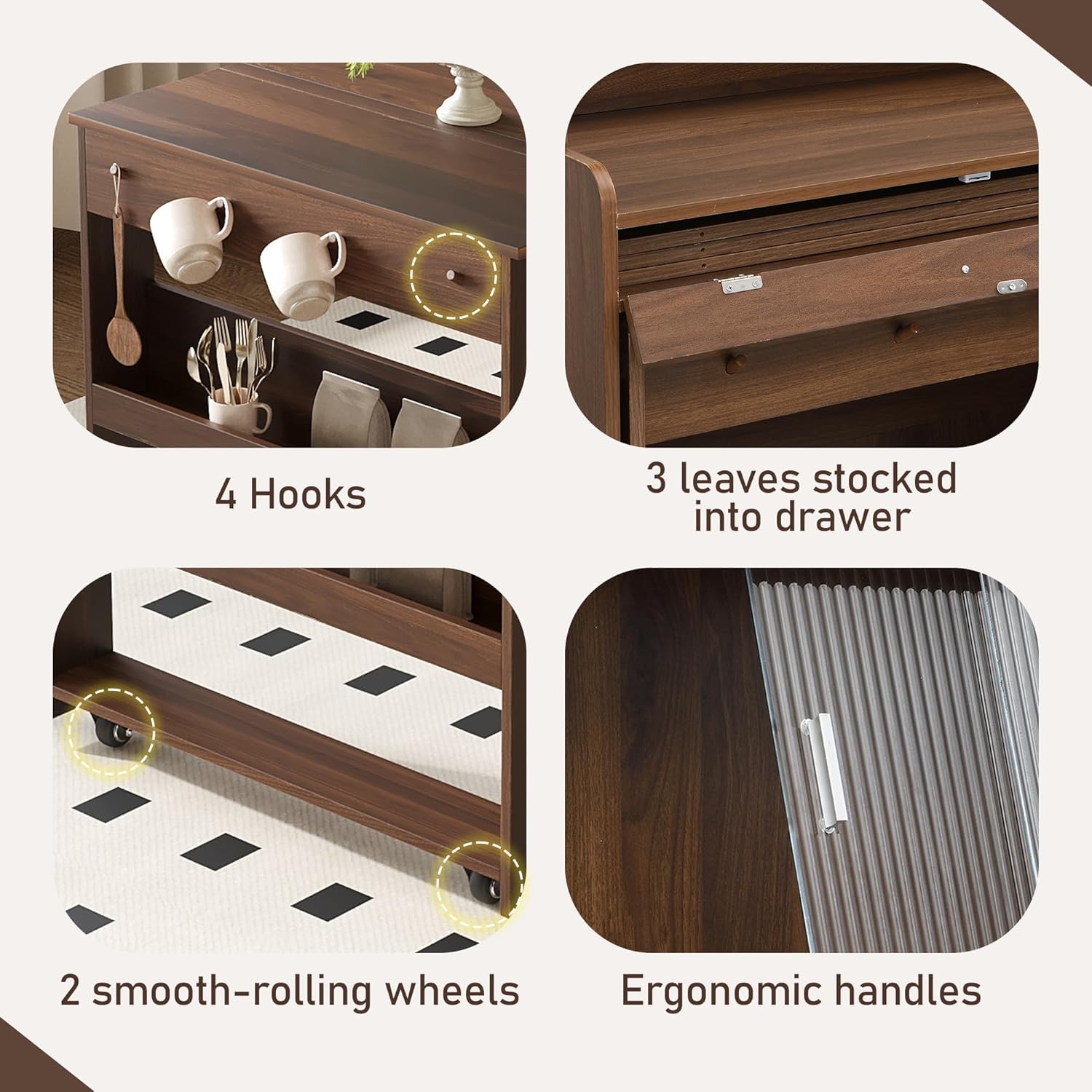 - โ Space-Saving Expandable Table: Extend the wheeled table from 0 to 50.4โL using removable leaves. When not in use, slide it under the buffet to save space. The counter-height workstation doubles as a coffee bar, office desk, or prep area, with a side shelf + 4 hooks for essentials.