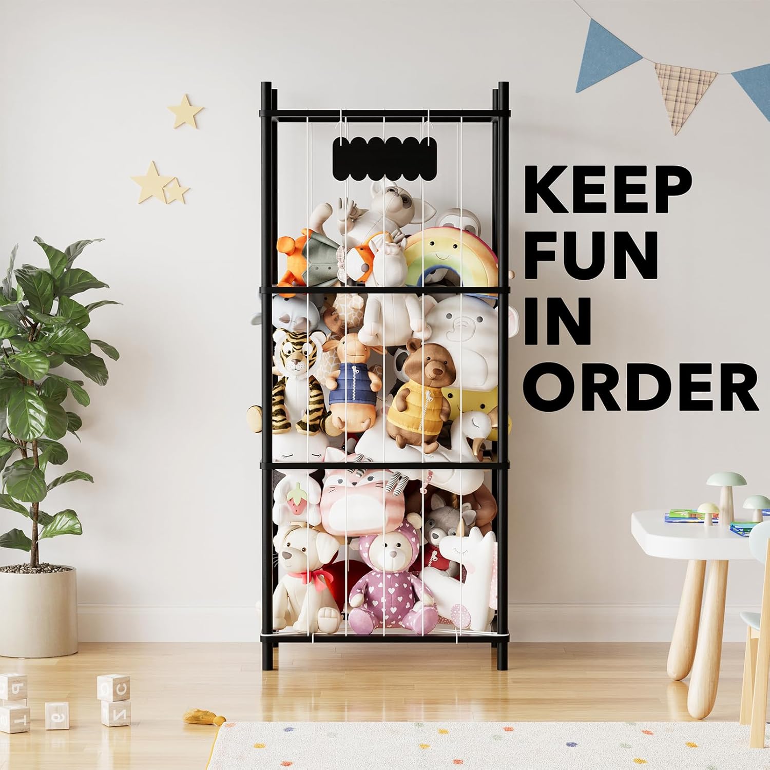 - EXTRA LARGE CAPACITY - The black spacious toy storage organizer can hold lots of stuffed animals easily, keeping playroom area organized; The open cage design encourages kids to pick up and put away toys on their own; SIZE: 22.8"W x 15.8"D x 53.6"H