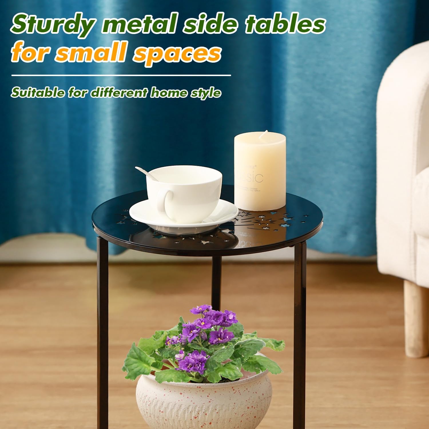 - Great Value Order: The outdoor side table gives you more options for arranging your patio or garden. Use them together or separately as an accent table set or as outdoor end tables. The metal side table is perfectly sized to fit in corners, taking up minimal space while providing a practical surface for placing items and adding a decorative touch to your home.