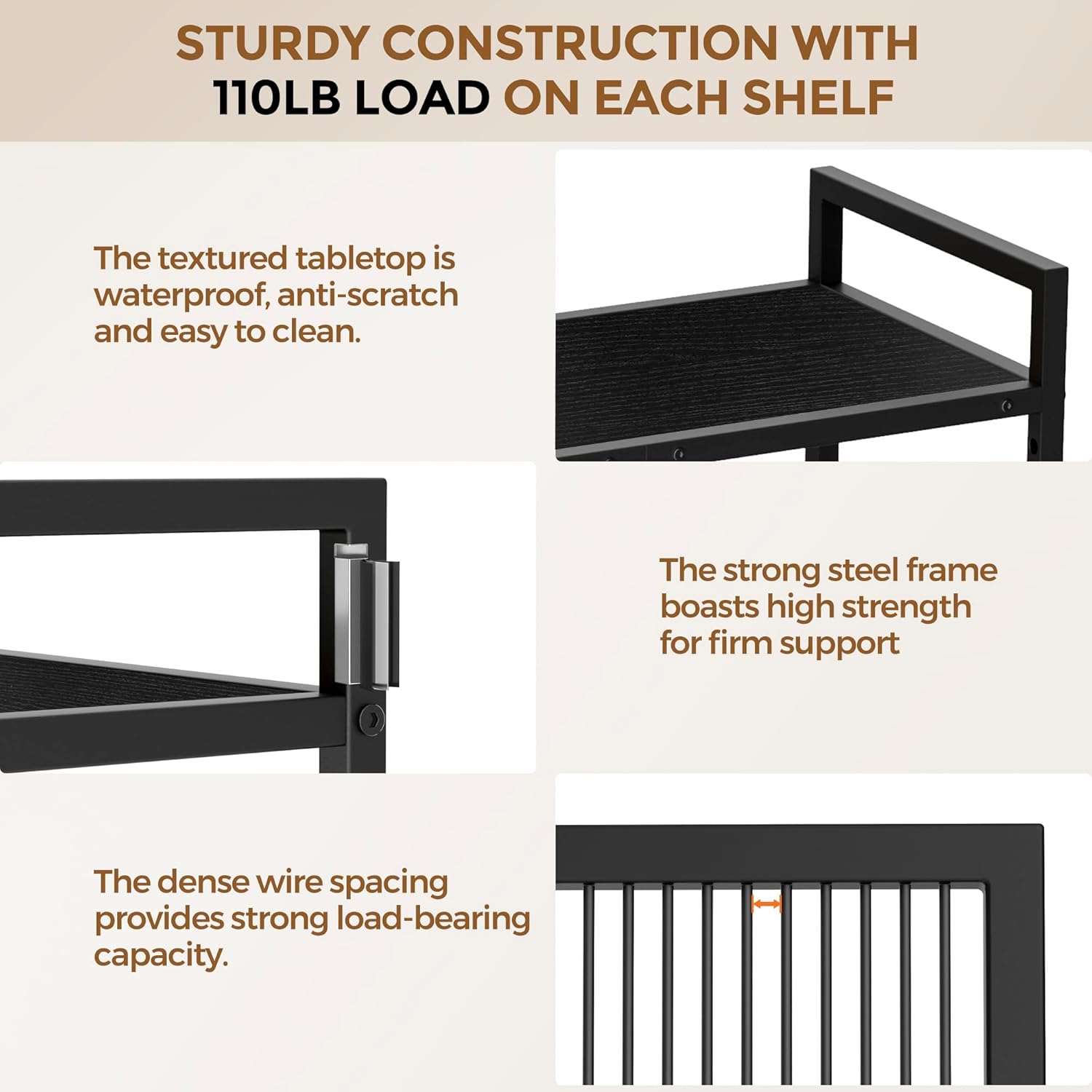 - 【Sturdy Construction With 110lb Load On Each Shelf】XIVIRACK kitchen storage rack organizer are made high quality materials.The textured engineered wood tabletop is waterproof, anti-scratch and easy to clean.The strong steel frame boasts high strength for firm support.The dense wire spacing provides strong load-bearing capacity.