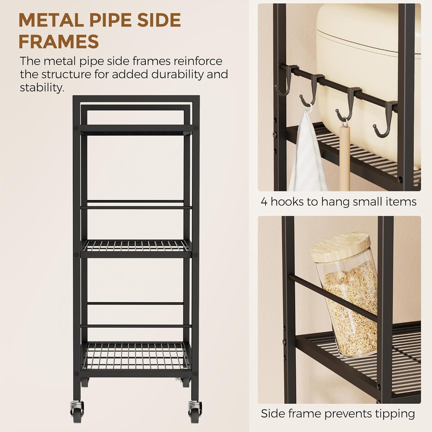 - 【Metal Pipe Side Frames & 4 Hooks】The metal pipe side frames help reinforce the structure, protect your items from falling off.It also includes 4 hooks, ideal for hanging small utensils like mugs, cooking spoons, dish towels, baking gloves, or whisks.