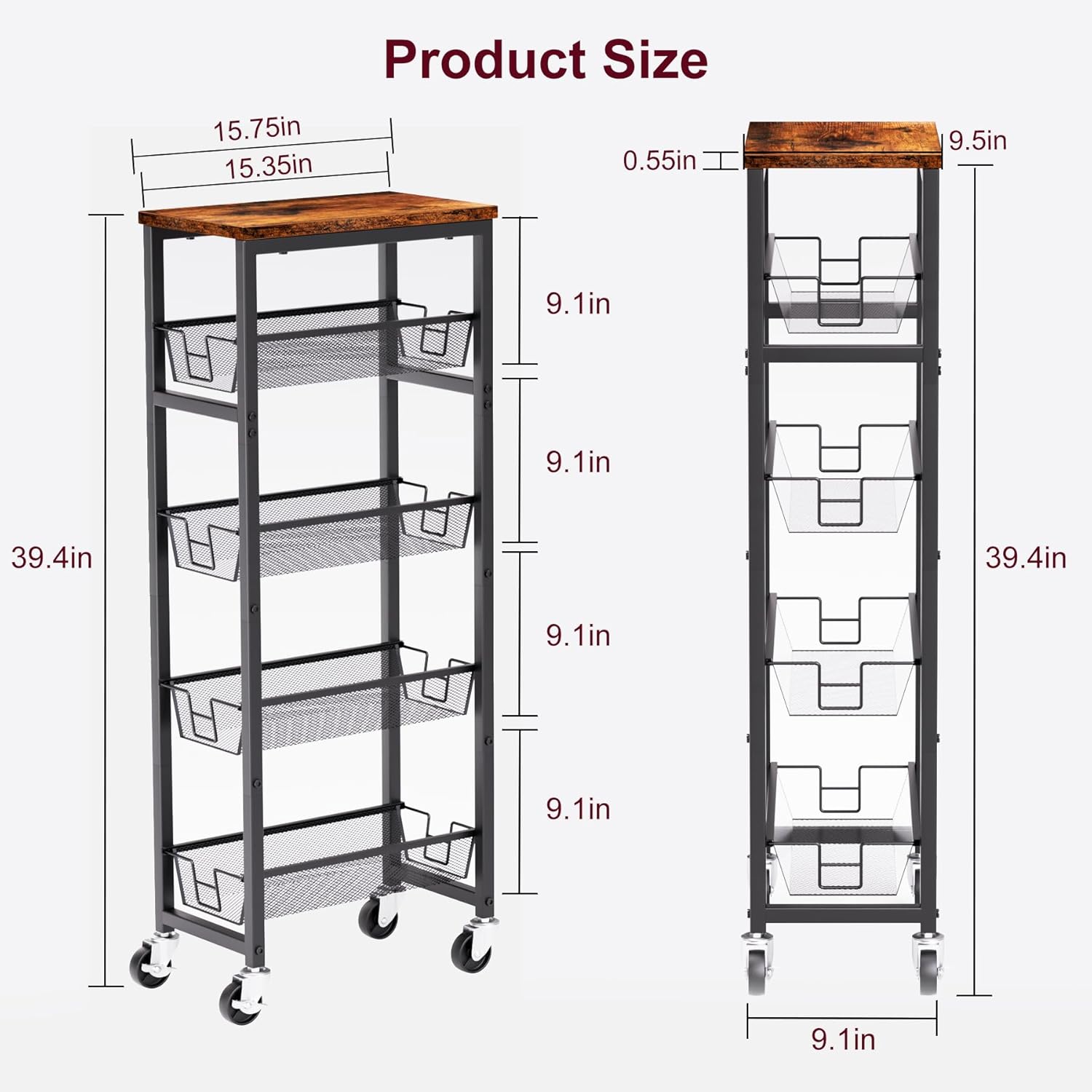 - Narrow Space Storage Cart: Measuring 9.1"D x 15.8"W x 39.4"H, this slim rolling cart fits perfectly into narrow spaces in kitchens, bathrooms, or living rooms, maximizing storage in otherwise unused corners.