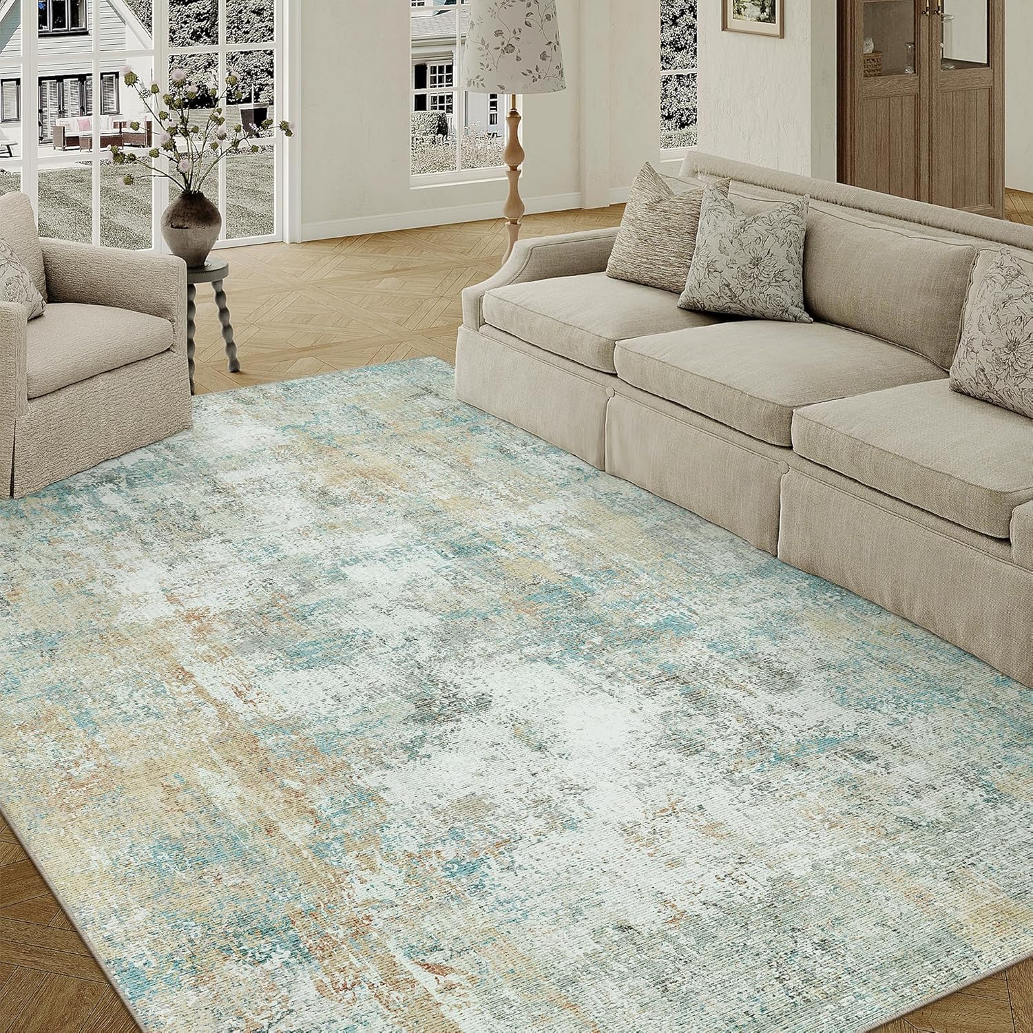 6x9 Washable Area Rug Teal Beige Modern Neutral Abstract Living Room Bedroom Indoor Floor Carpet Low Pile Soft Non-Slip Lightweight Vacuumable Throw Rug for Nursery Dining Room Office