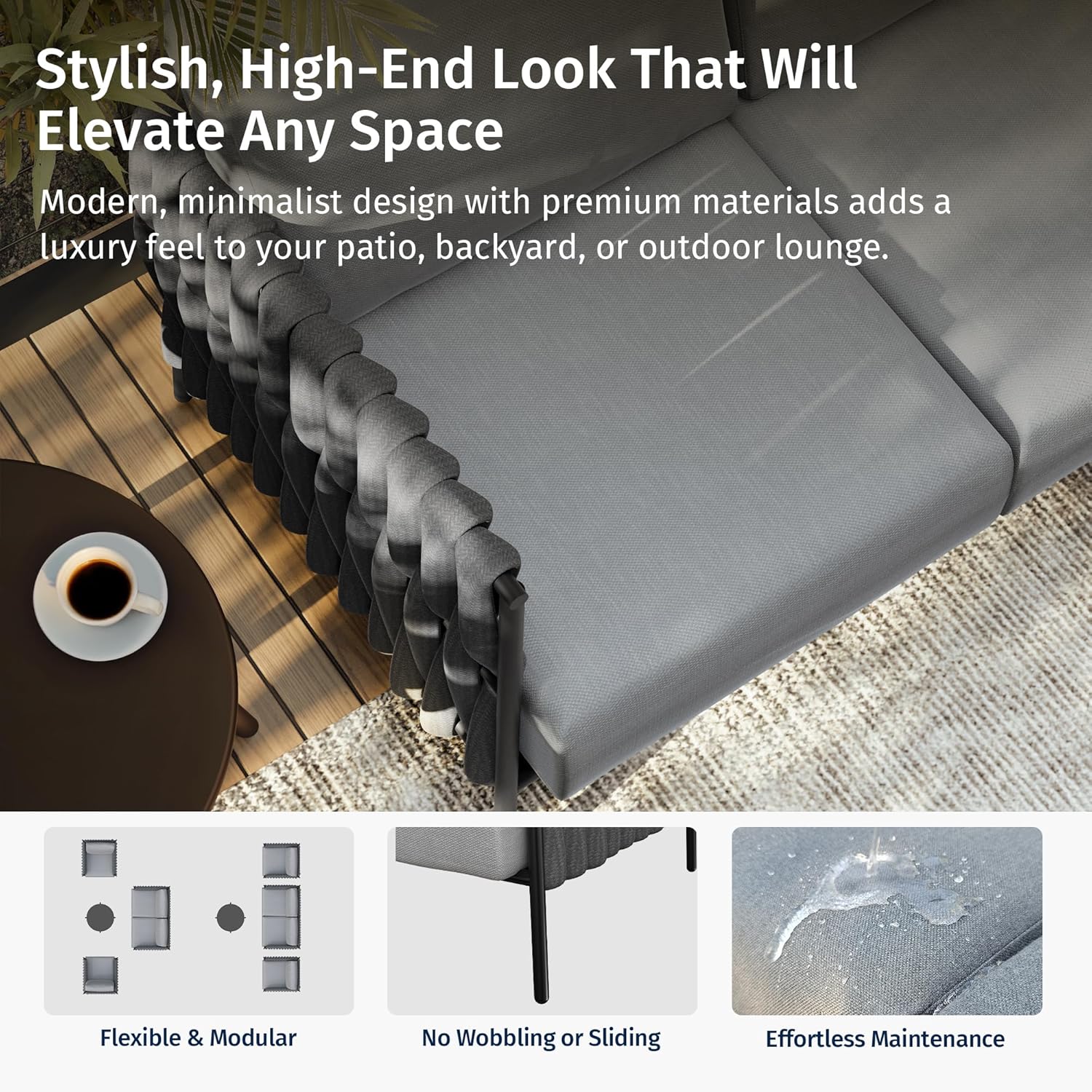 - TRANSFORM YOUR BACKYARD IN STYLE: Designed by EAST OAK with a patented modern look, this corner sectional set instantly elevates any outdoor space. Its sleek, contemporary design adds a sophisticated touch to patios, balconies, and gardens—creating a stylish, inviting atmosphere for relaxing or entertaining