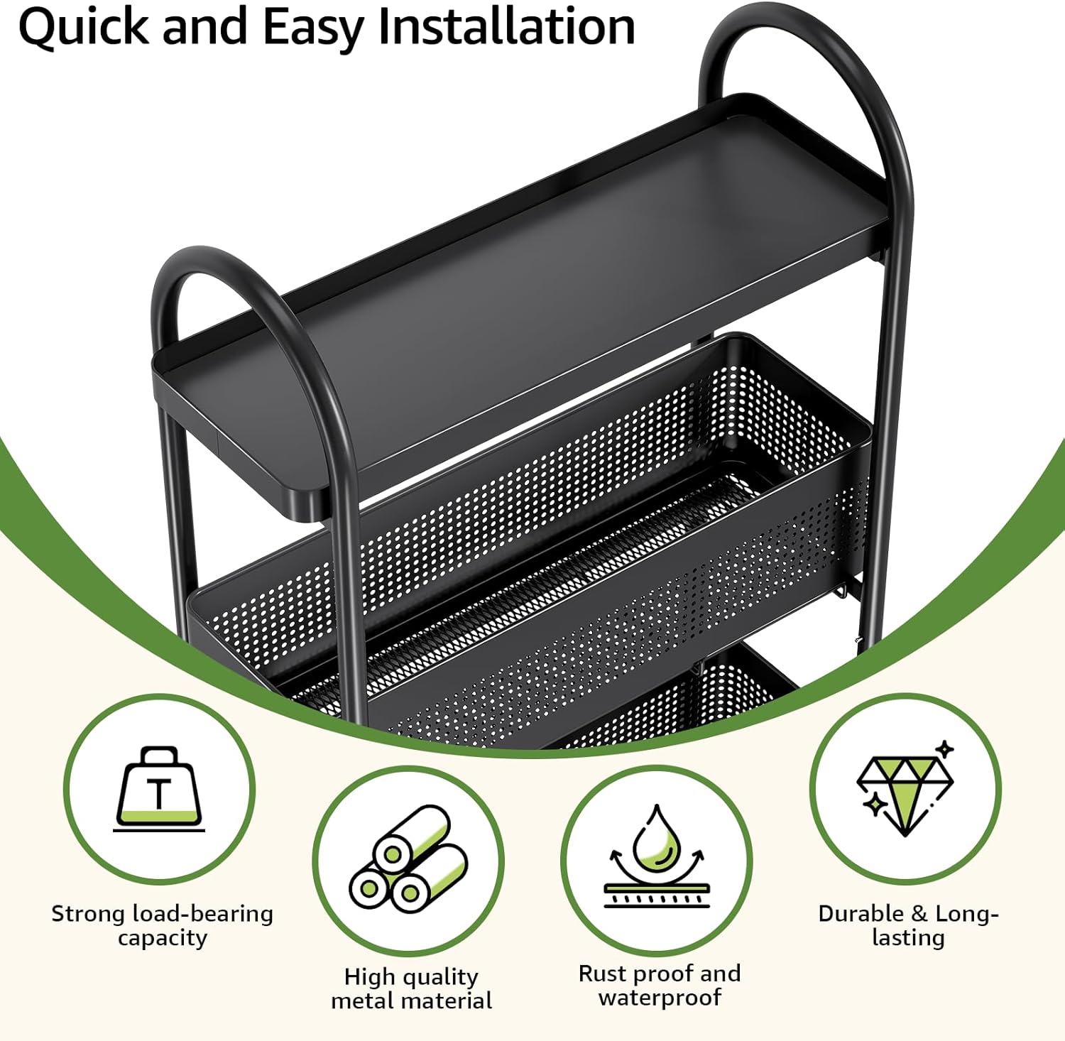 - ăEasy to InstallăThe mesh storage cart is made of high-grade metal material.Ergonomic handle and poles will not deform easily. Smooth surface won't scratch you. Includes all tools and instructions for quick, easy assemblyâa convenient addition to any room.