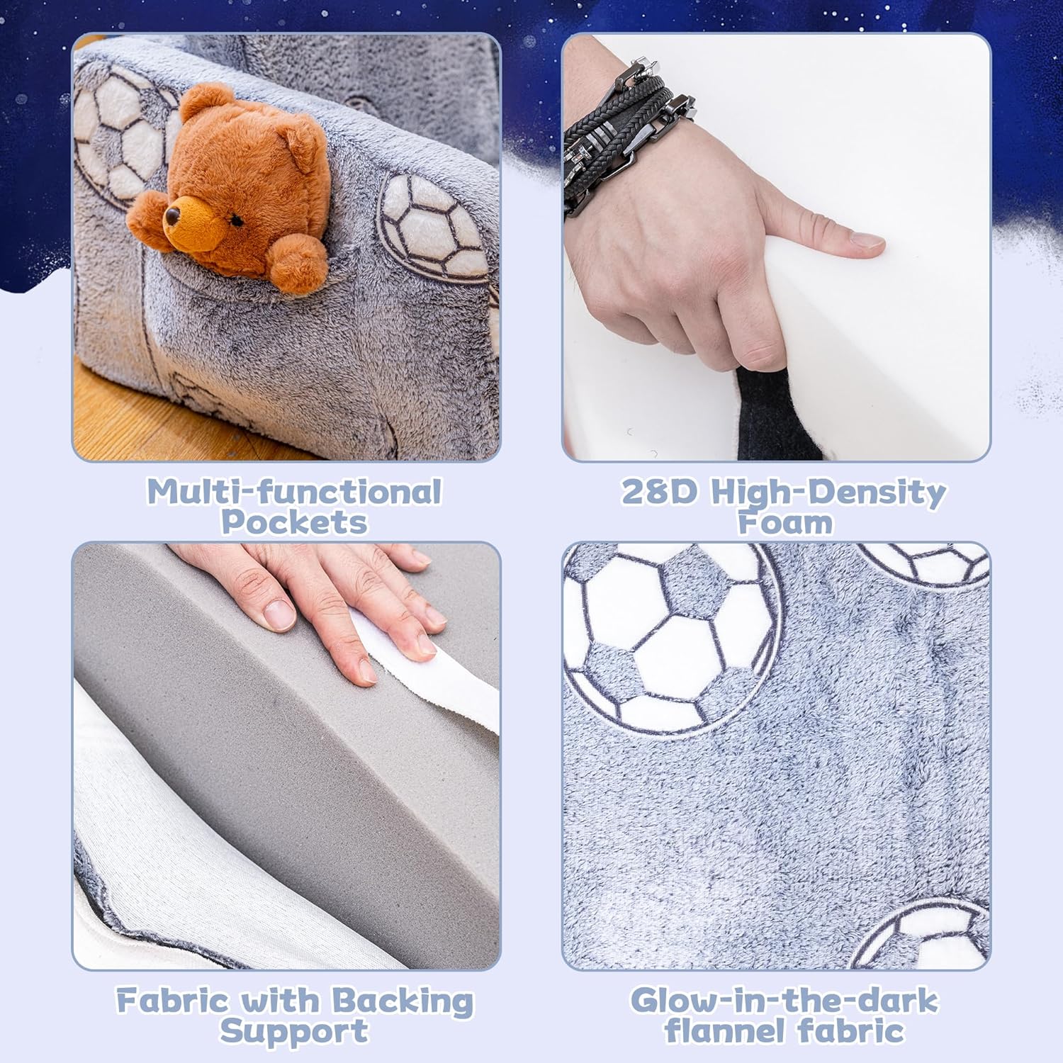 Lamerge 2-in-1 Soft Toddler Couch Fold Out,Foldable Toddler Chair, Glow in The Dark Kids Sofa for playroom,Convertible Foam and Floor Cushion for Boys and Girls (Grey and Football)