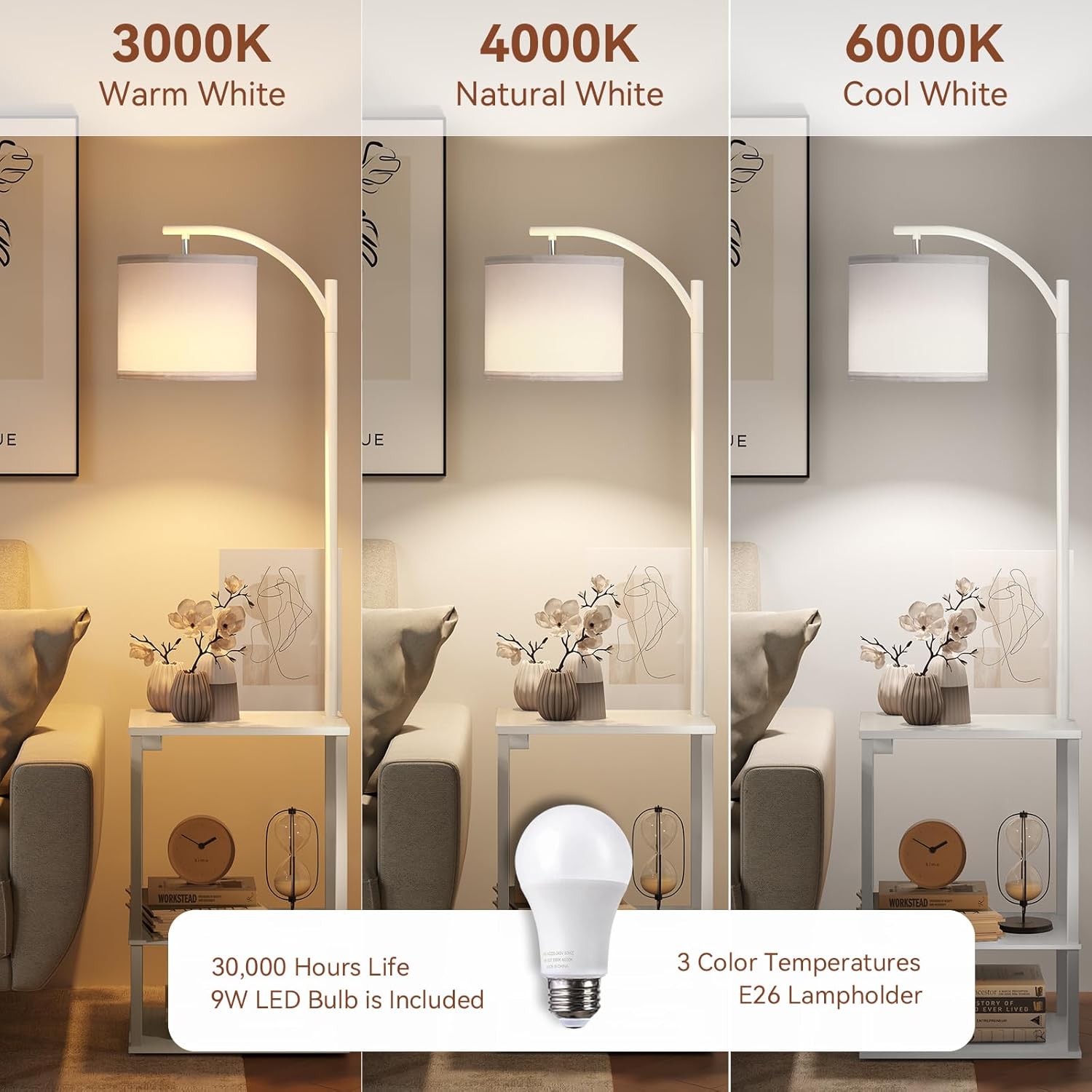 - 3 Color Temperature Floor Lamp: This floor lamp with shelves includes a 9W, 800-lumen energy-efficient E26 LED bulb. This LED floor lamps bulb is 3 color temp: 3000K/4000K/6000K. Equipped with a non-dazzling linen lampshade, it emits gentle light thatβs easy on the eyes and reduces eye strain, which is perfect for both lighting and helping decorate your space. Easily switch color temperatures manually to create the perfect ambiance for different scenes.
