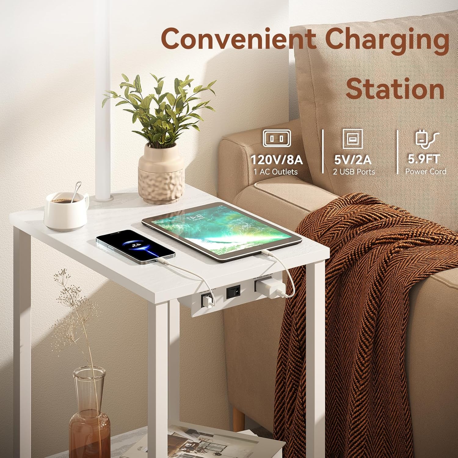 - End Table with Charging Station: This table lamp is built with 2 USB ports (5V/2A), 1 AC charging port (120V/8A), and a 5.9ft power cord. It provides a convenient charging spot for mobile phones, laptops, earphones, watches, and other electronic devices, all of which are easily accessible at your fingertips. As a practical piece of furniture for living rooms and family spaces, it lets you enjoy cozy ambiance while keeping devices powered up.