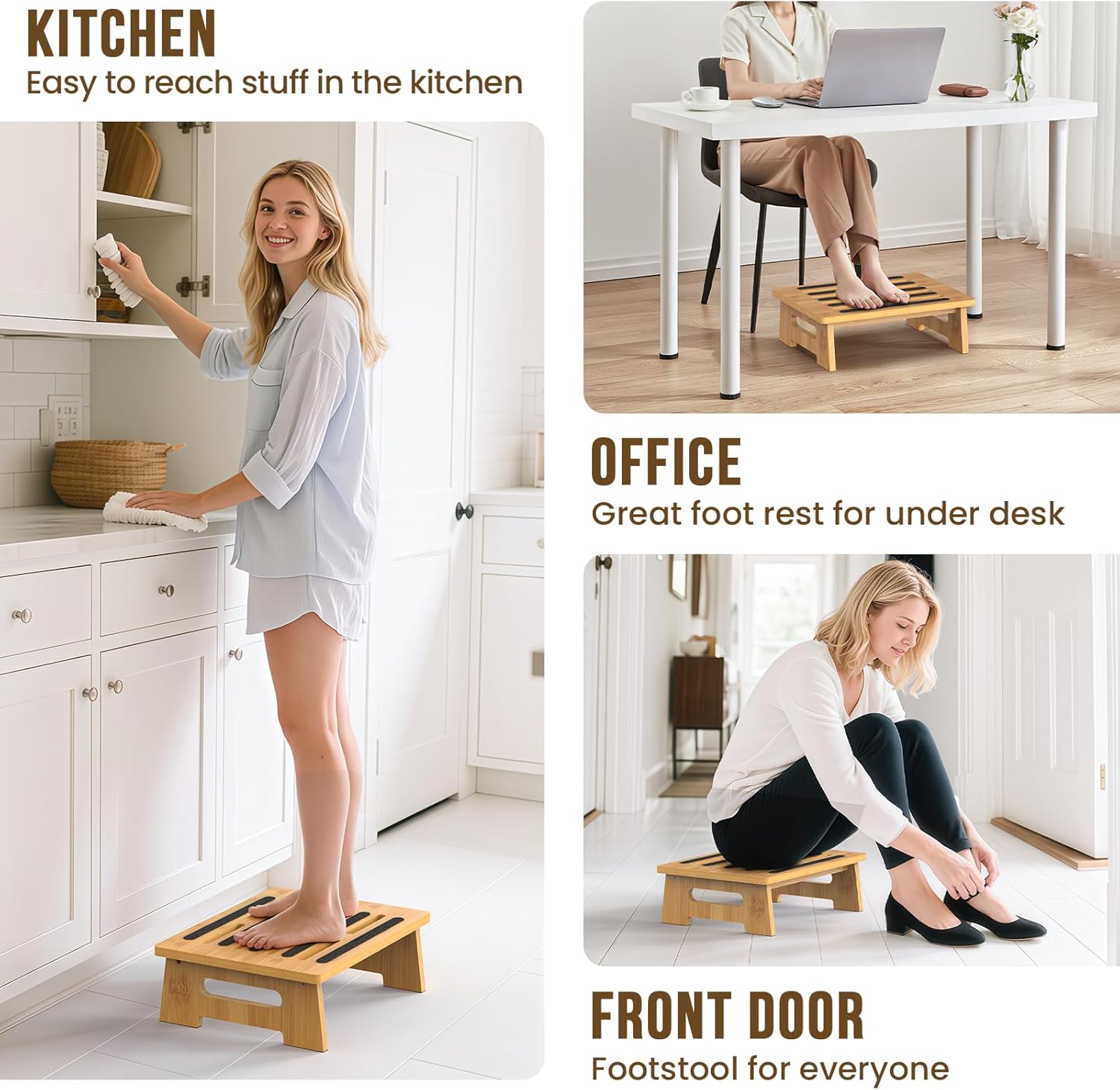 - COMPACT & DURABLE DESIGN FOR ANY ROOM: Fits perfectly where you need it! This lightweight yet incredibly durable bamboo one step stool is ideal as a space-saving bathroom stool near the vanity, a quick-access helper in the pantry, or sturdy bed steps. Natural bamboo resists moisture and wear