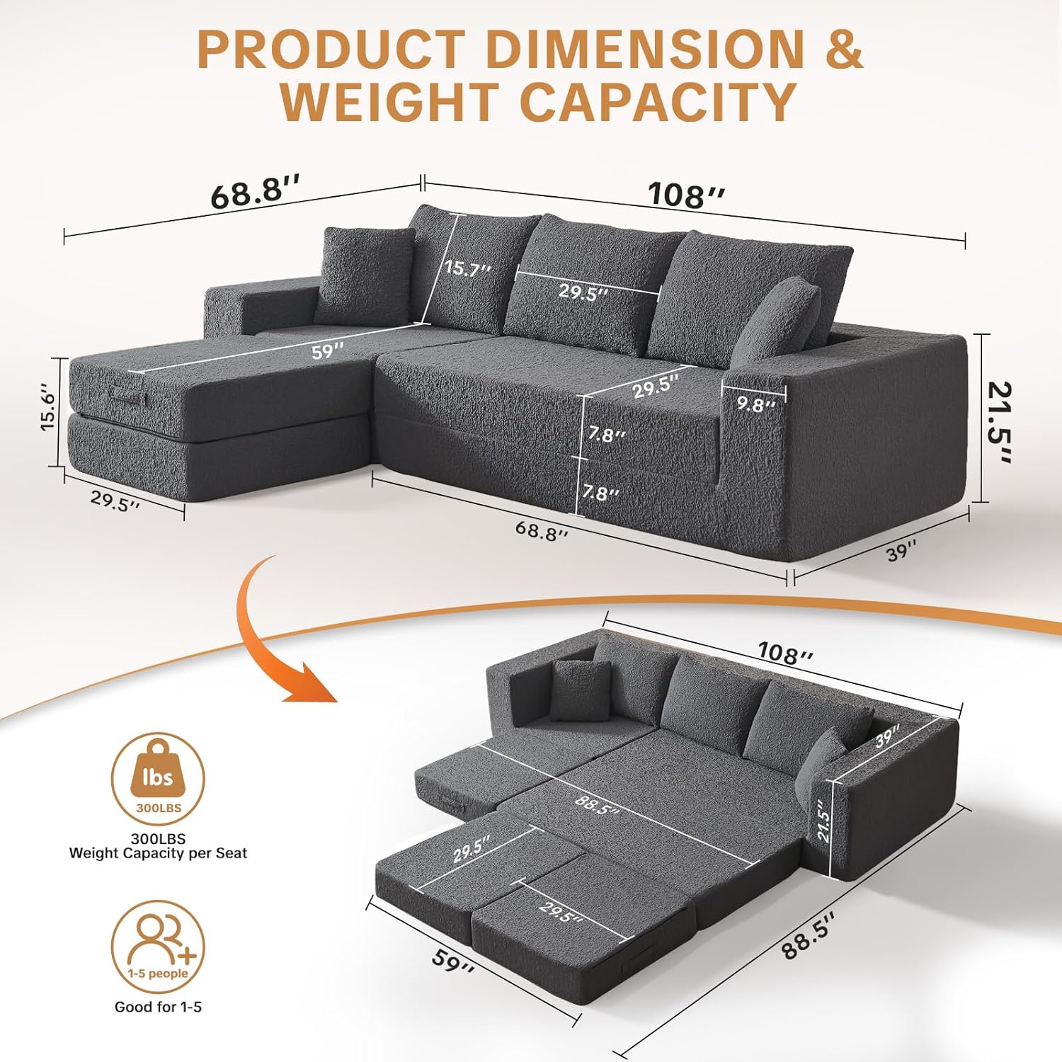 - Product Dimensions : 68.5"D x 108"W x 21.5"H