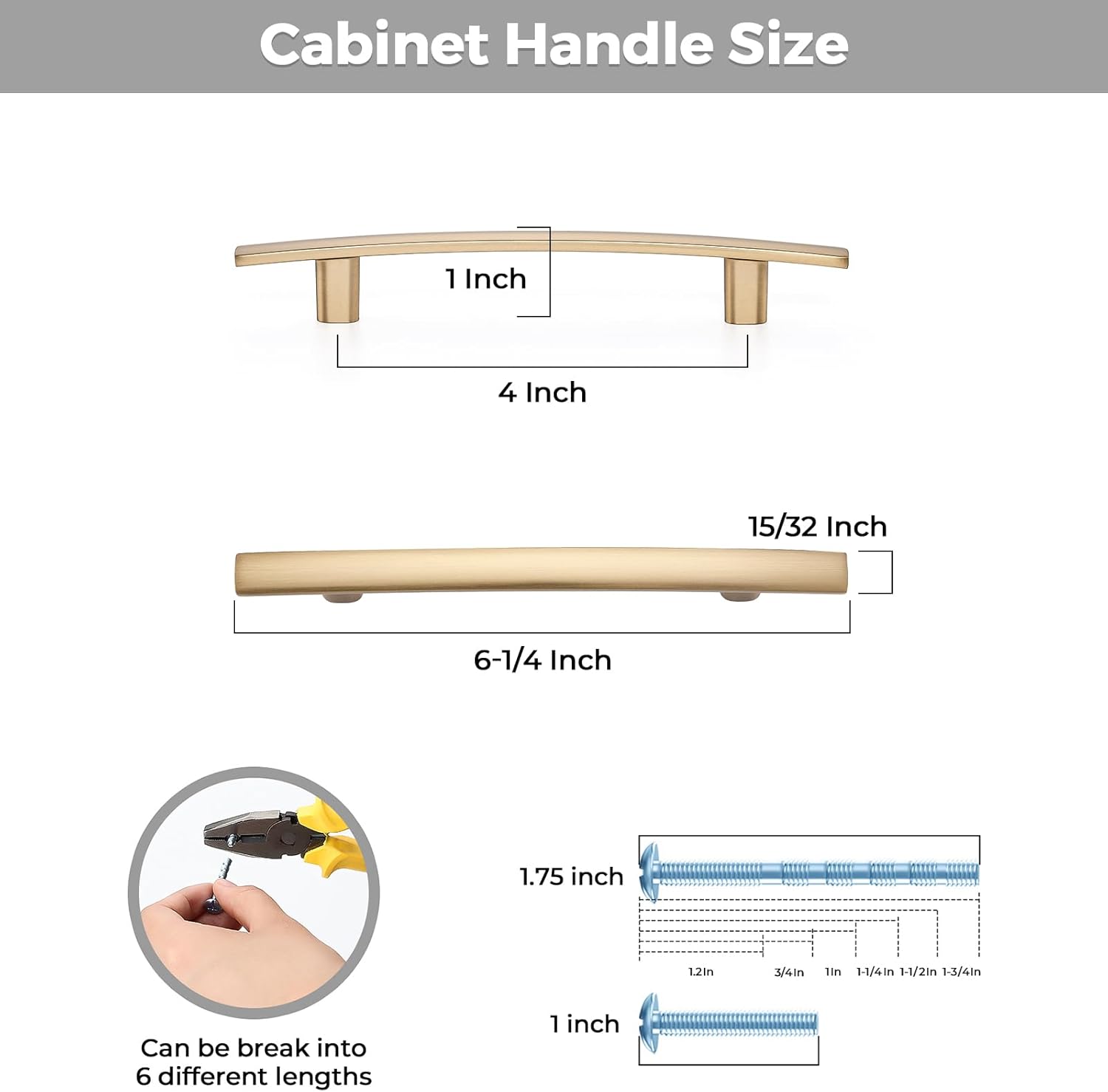 - Cabinet Handle Size: Hole Center: 4 inch(102mm), Overall Length: 6-1/4 inch(158mm), Width: 15/32 inch(12mm), Height: 1 inch(25mm)