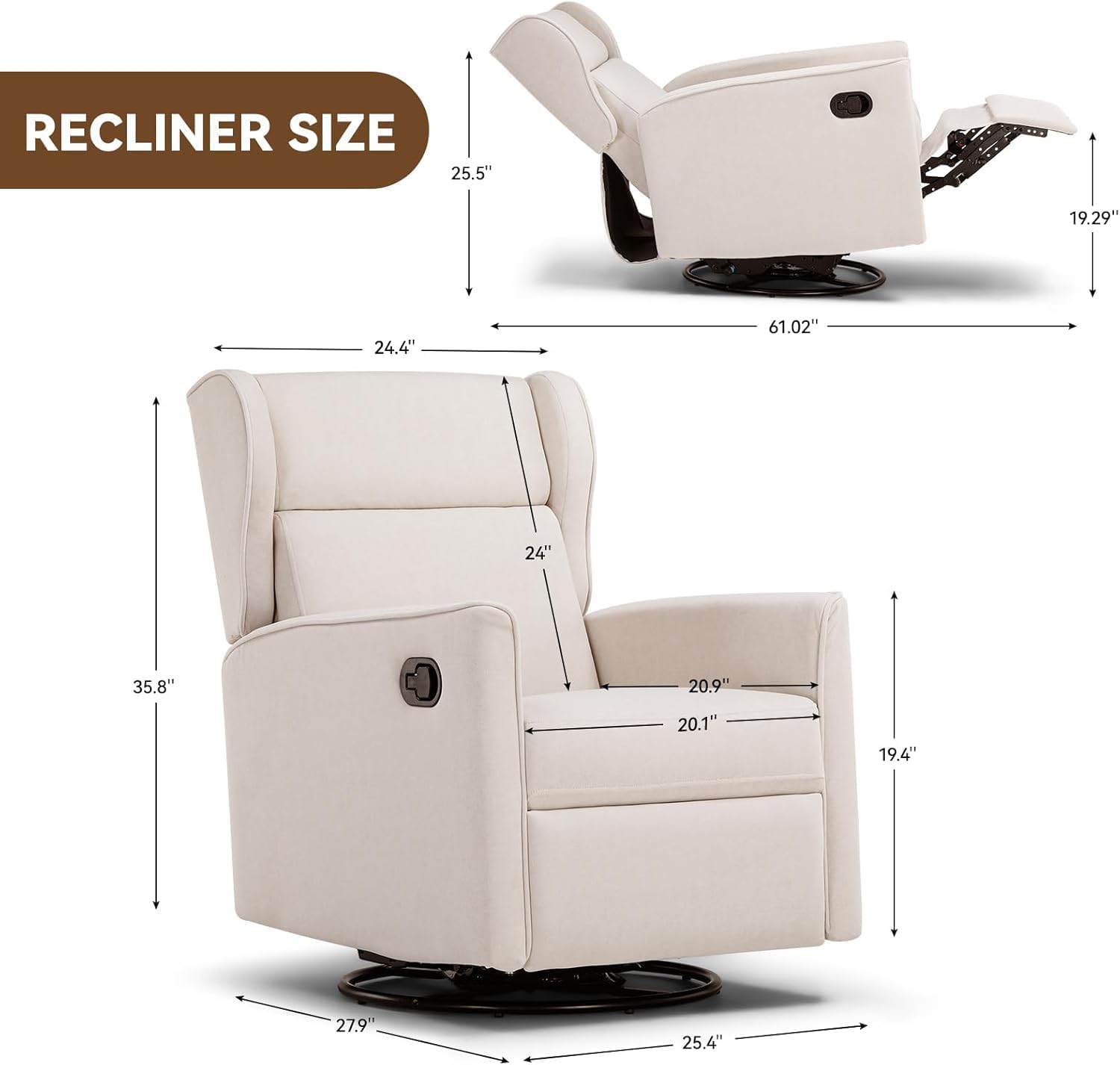 - ăEasy to AssembleăThe rocker recliner chair only takes 10 minutes for one person to assemble.According to the instructions provided,it only takes a few steps to install the backrest and the widened two-wing backrest.Our swivel recliner is a great choice for relaxing at home