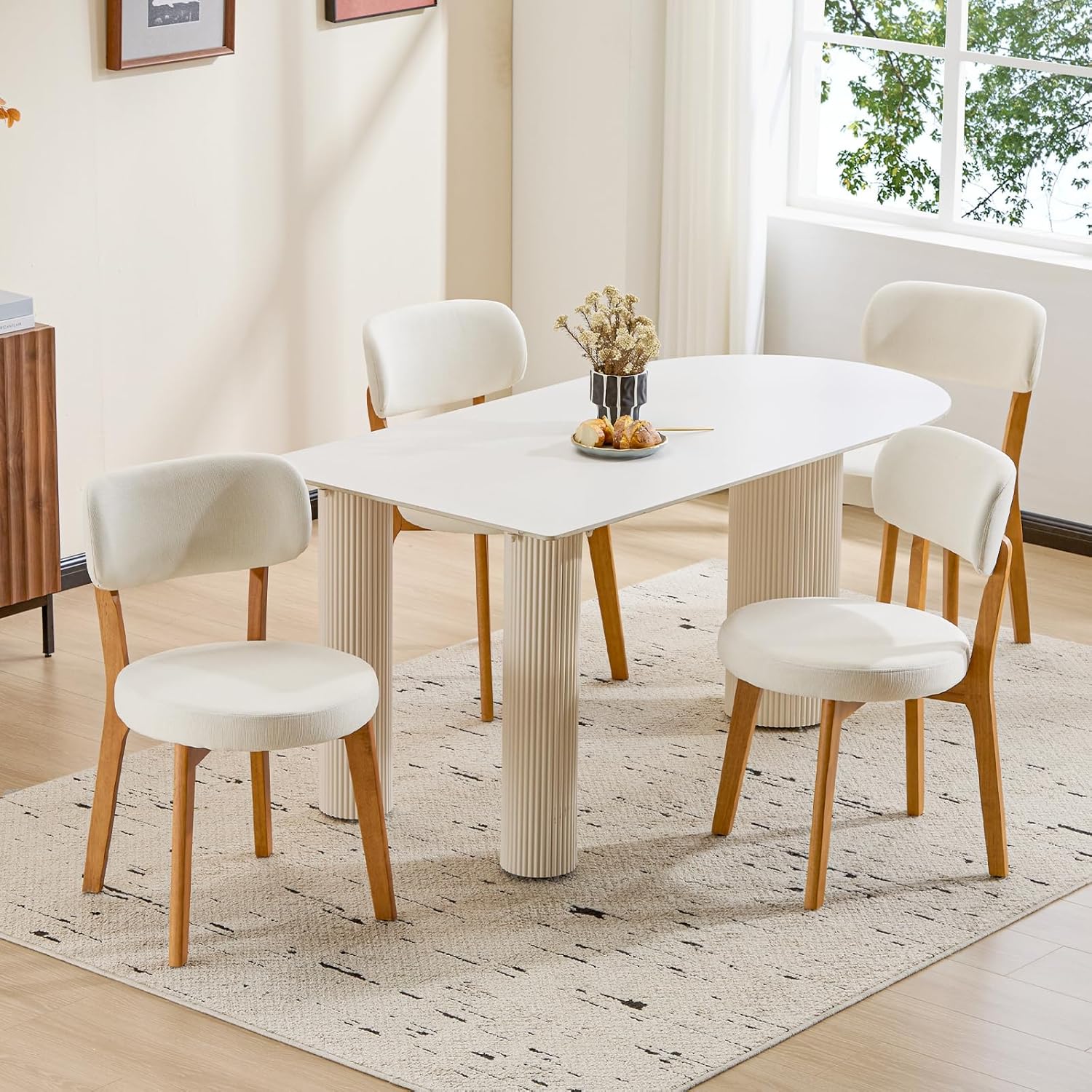 Furniliving Oak Wooden Dining Chairs Set of 4, Mid-Century Modern Linen Upholstered Kitchen Chair with Solid Wood, Farmhouse Dining Room Chairs, Beige